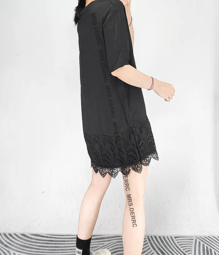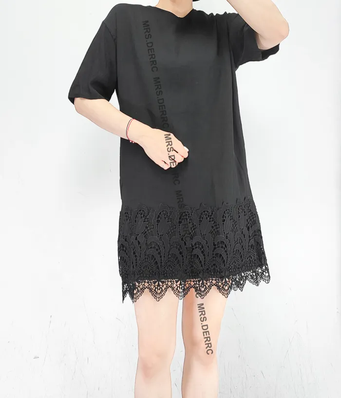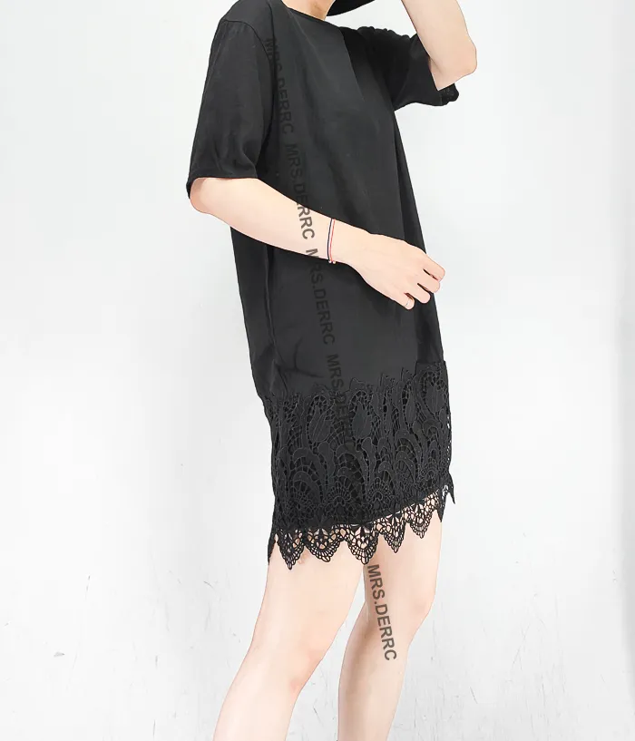 綿混紡下拼接蕾絲小洋裝(黑色)