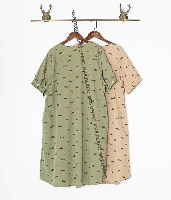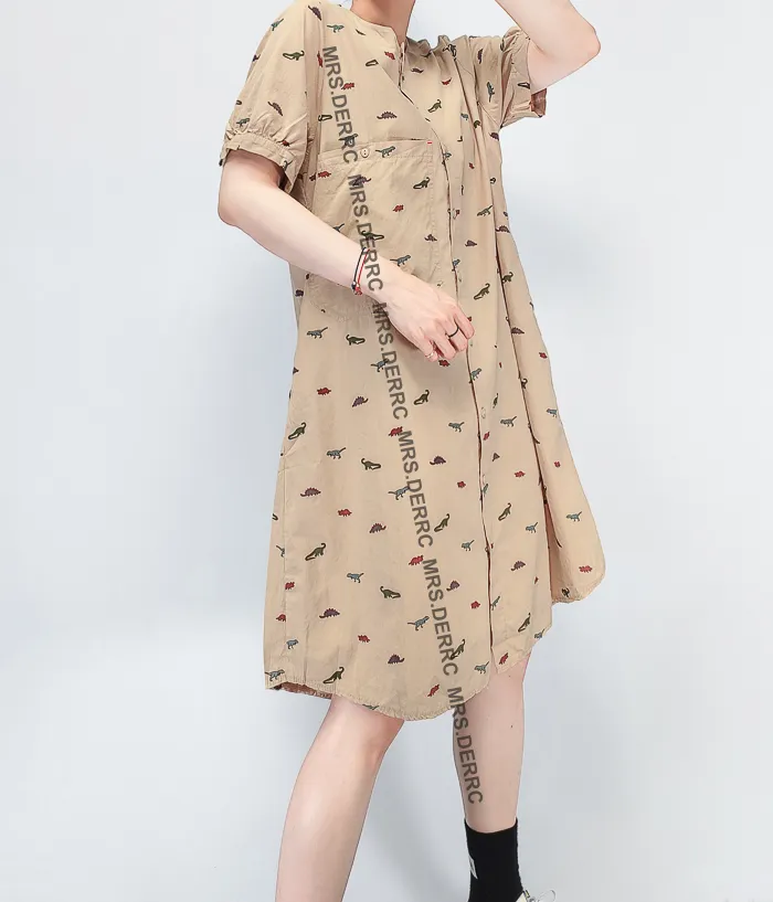 棉混紡彩色恐龍開釦三個口袋洋裝(淺咖)