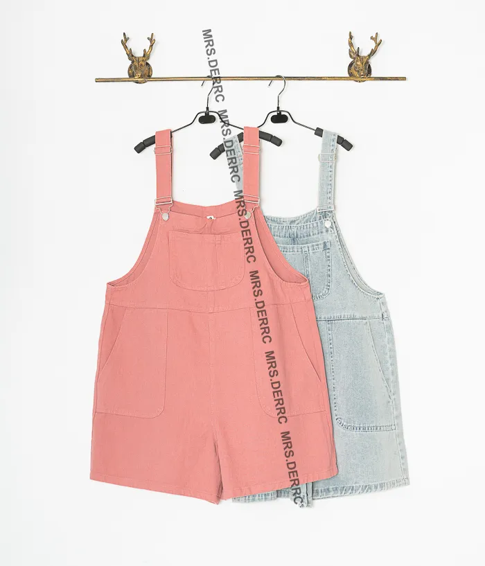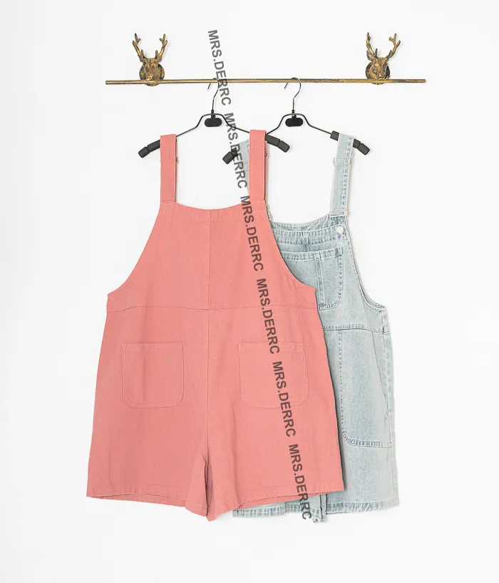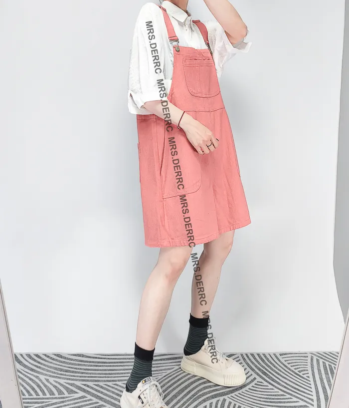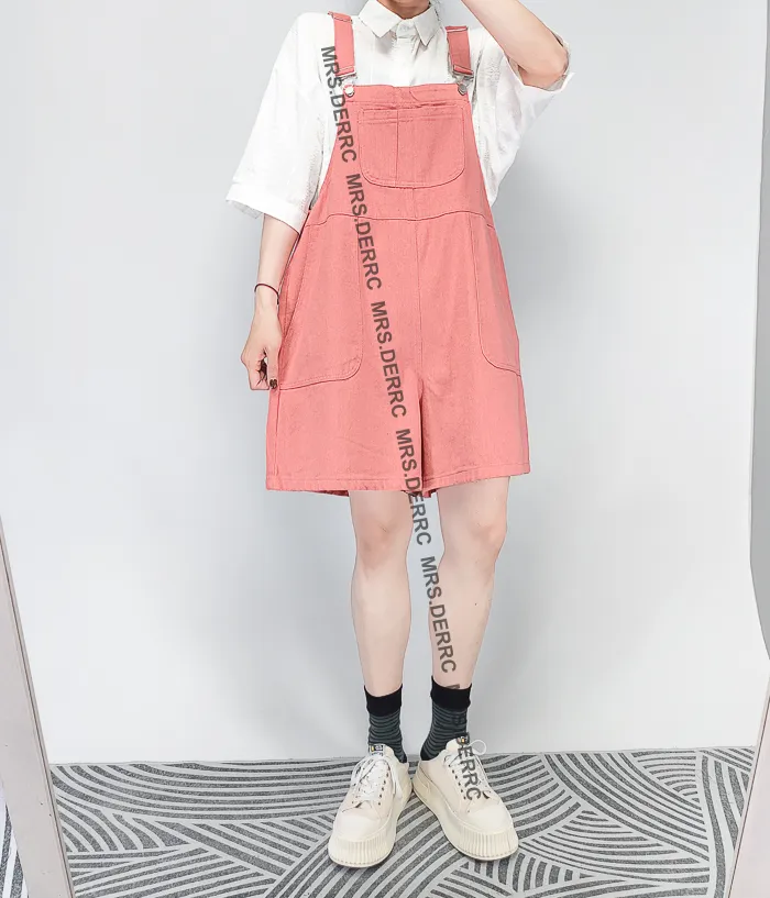 牛仔銀釦多口袋吊帶短褲(珊瑚紅)