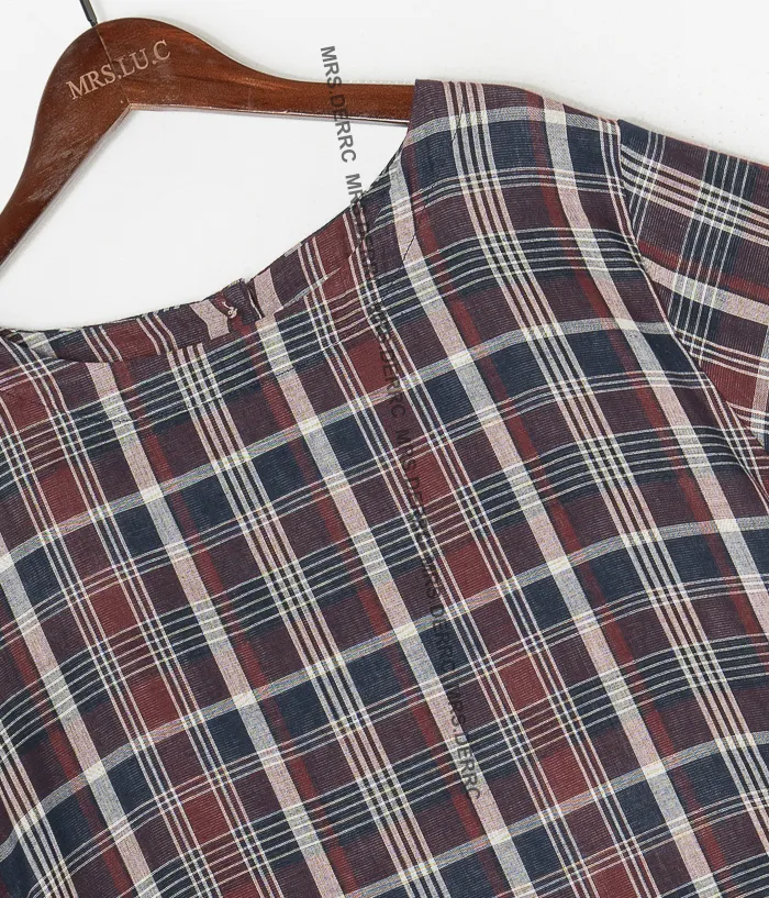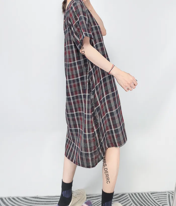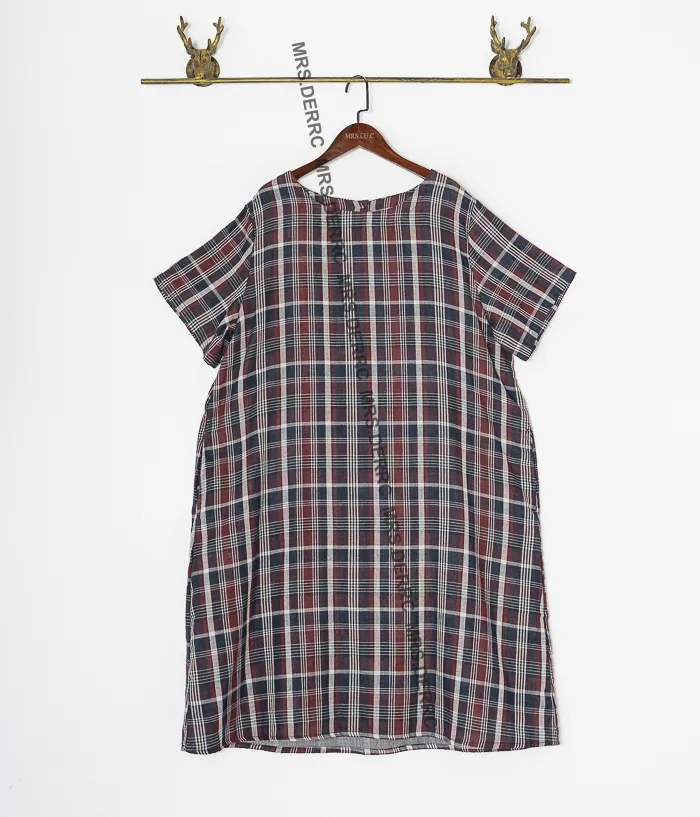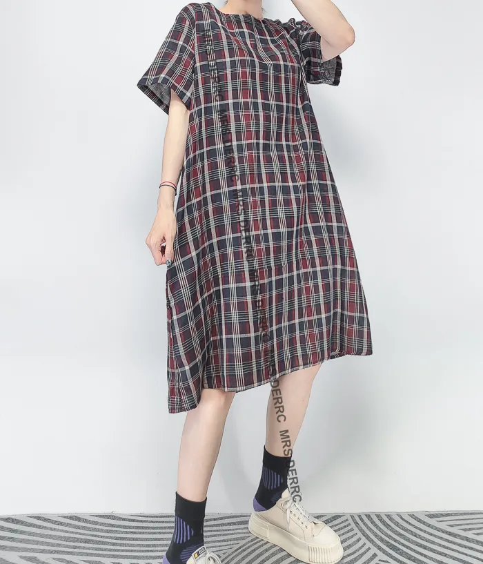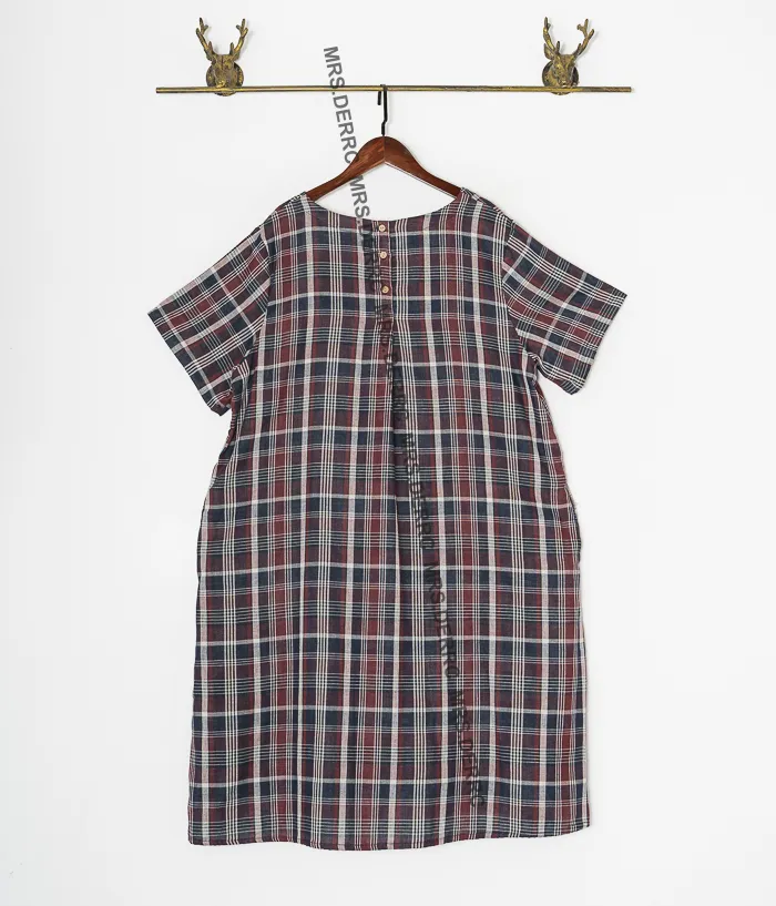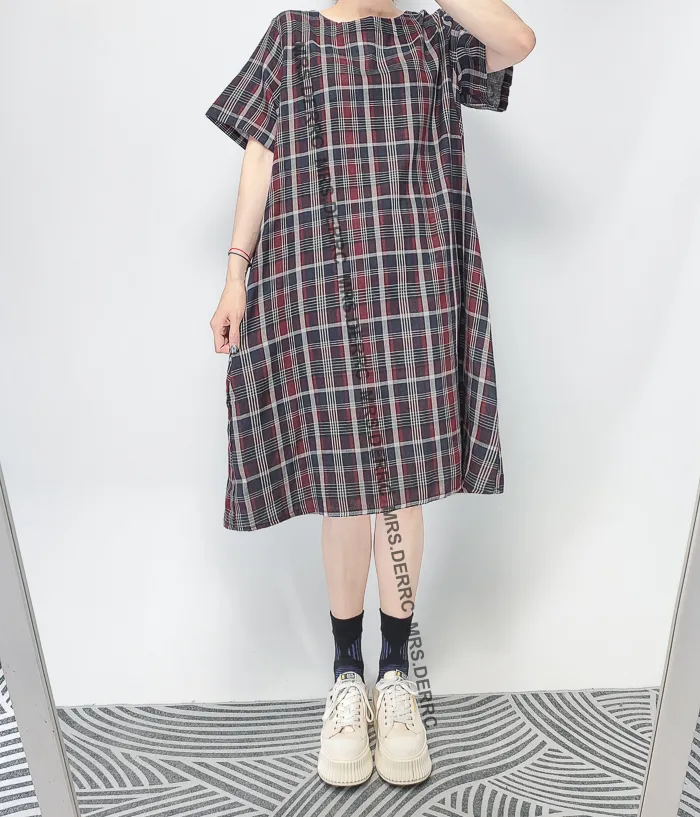 棉質後開釦日式格紋口袋洋裝(紅藍格)