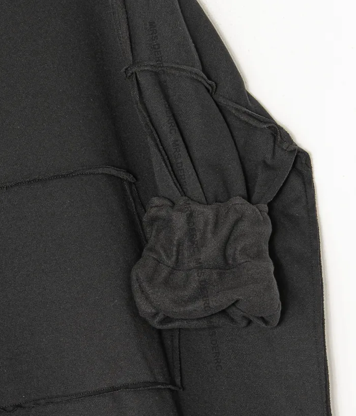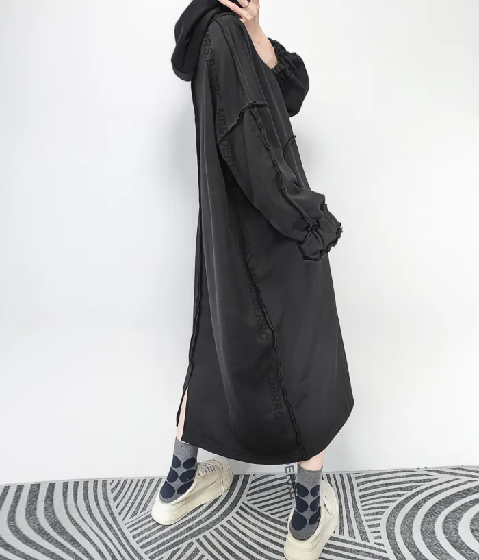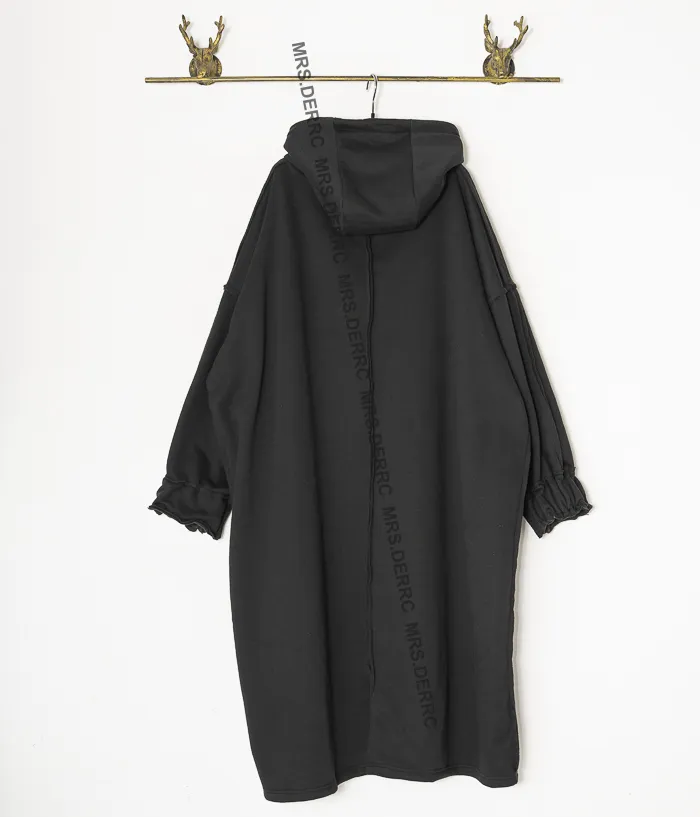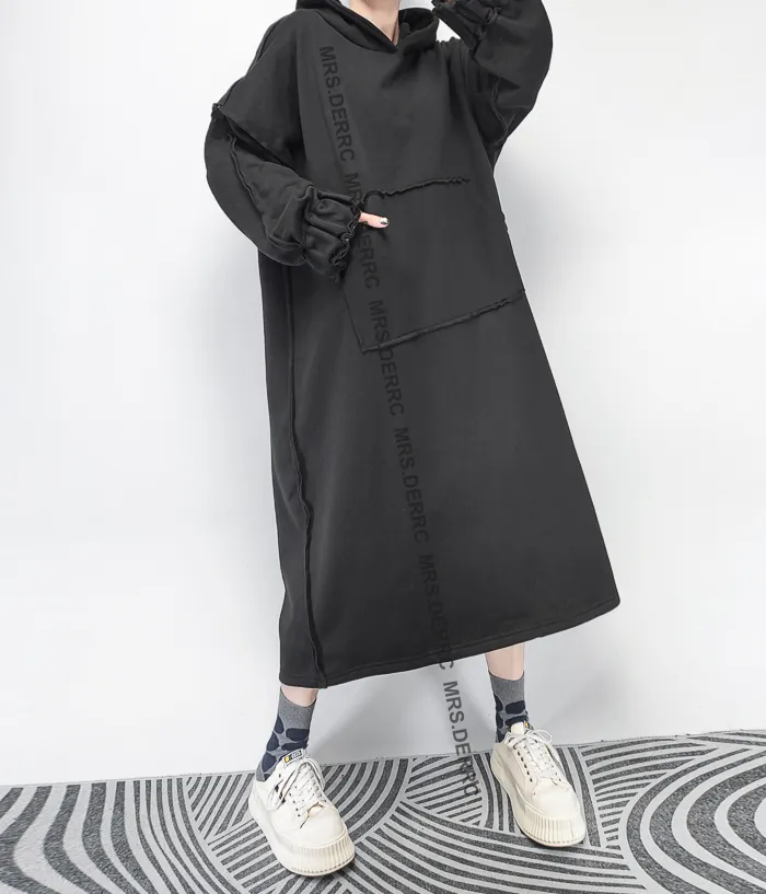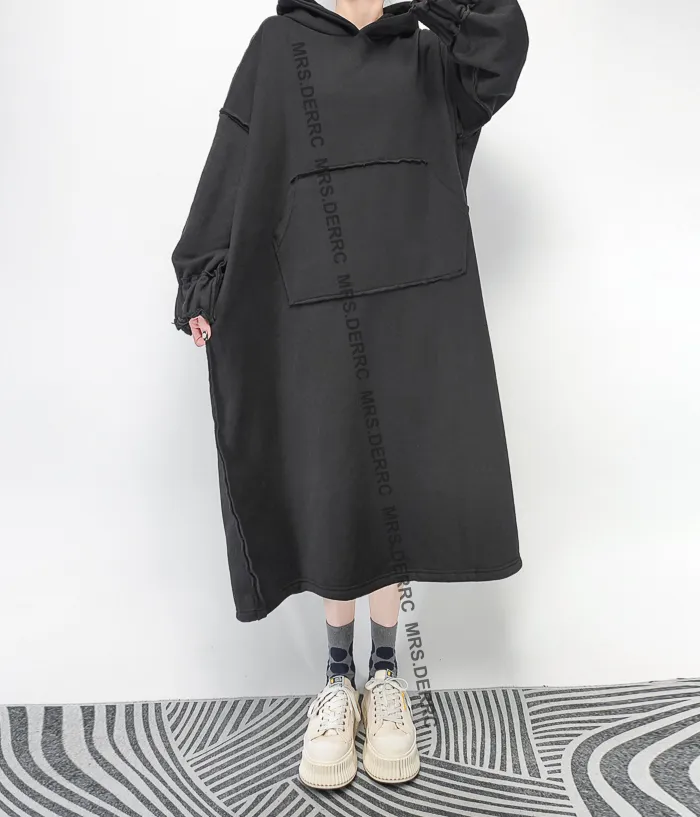 棉混紡寬鬆內磨毛連帽肚子口袋寬鬆洋裝(黑色)