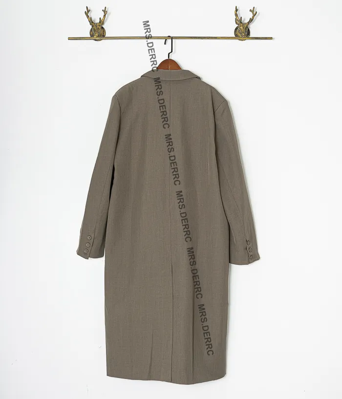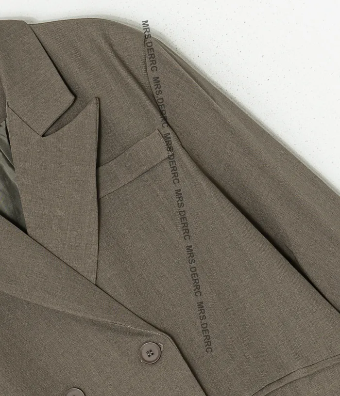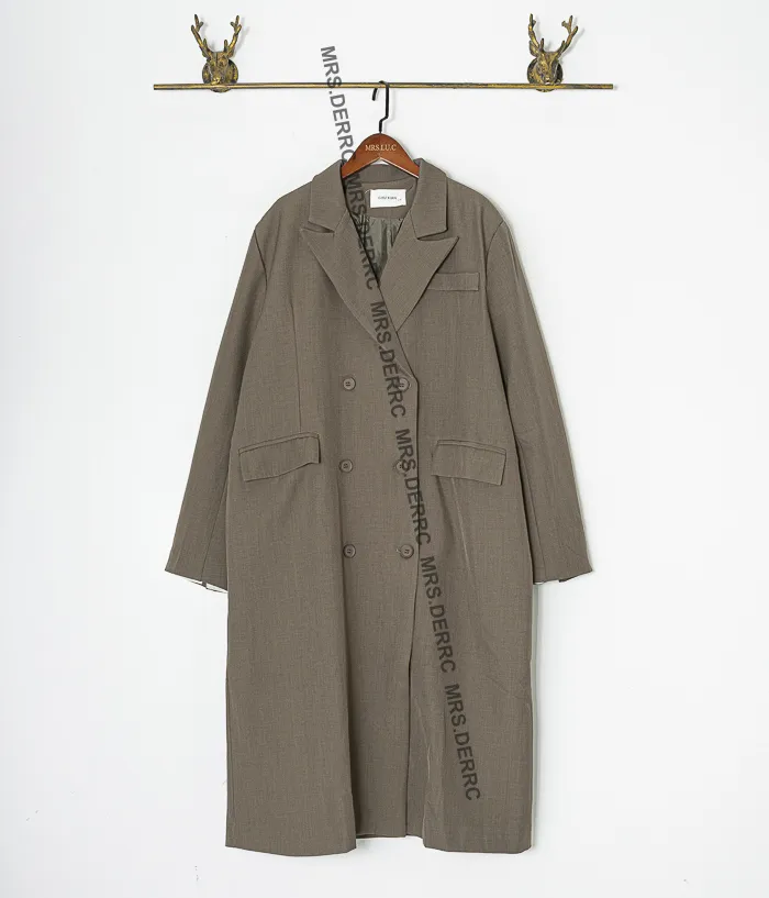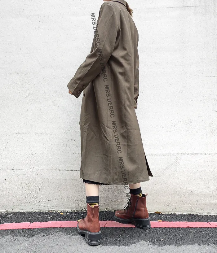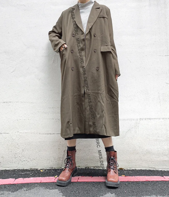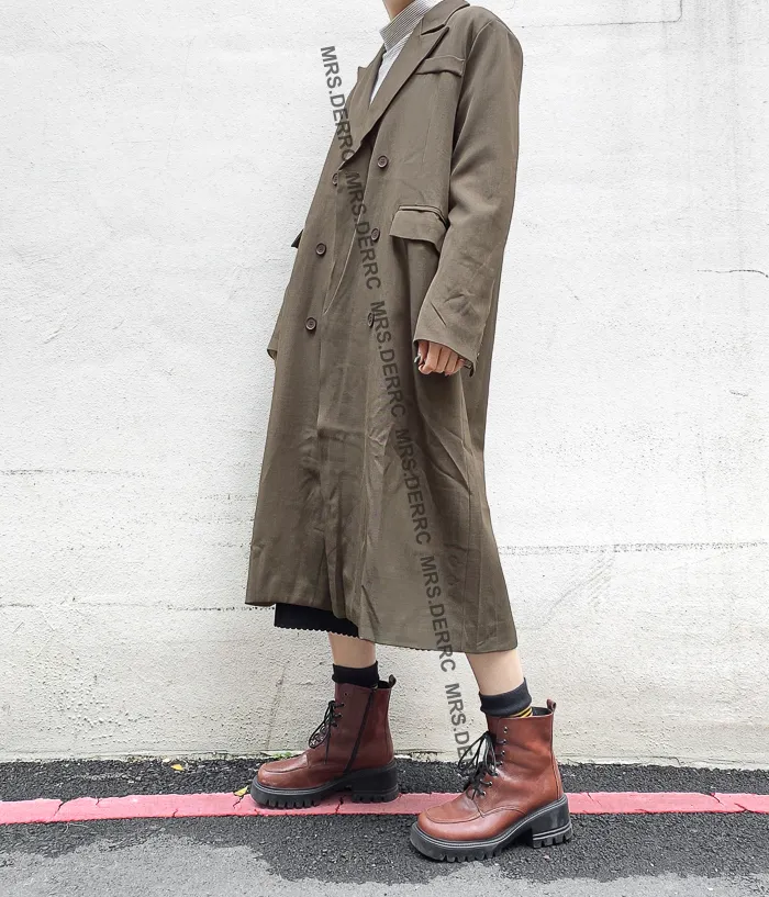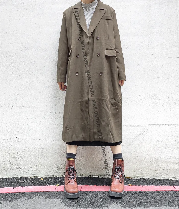棉混紡雙層西裝有墊肩長版排釦口袋外套(灰綠)