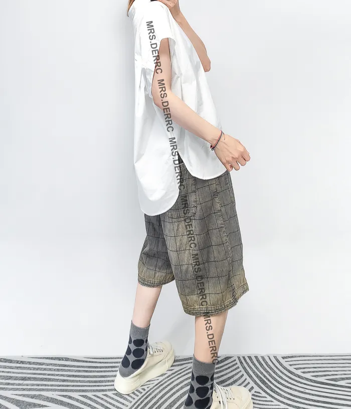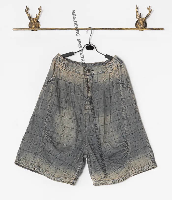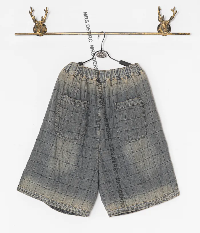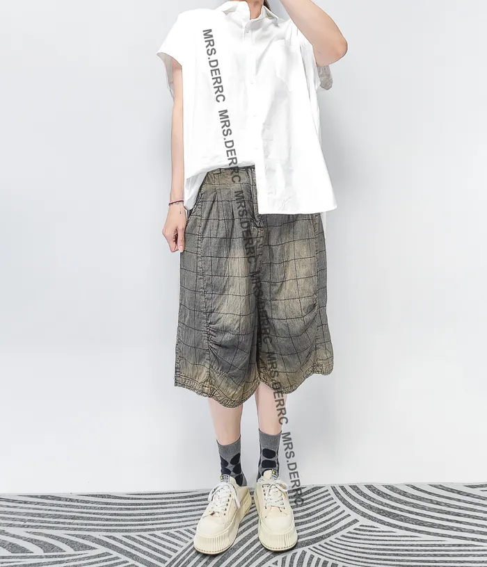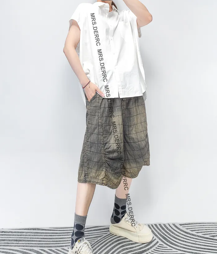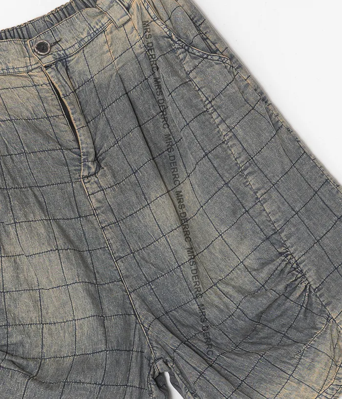 水洗刷色格紋刷舊造型拉鍊口袋五分褲