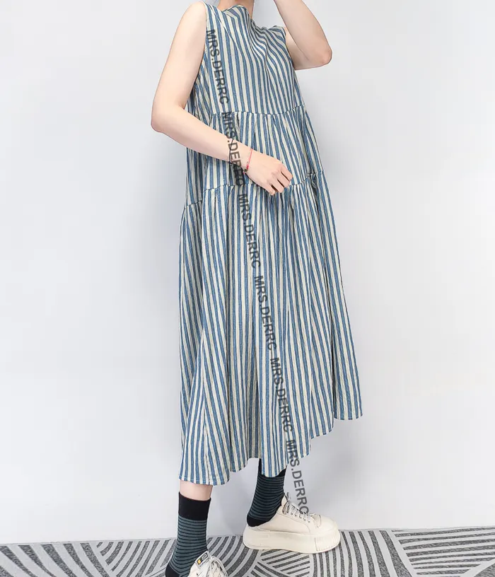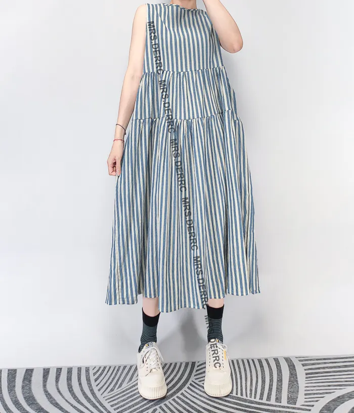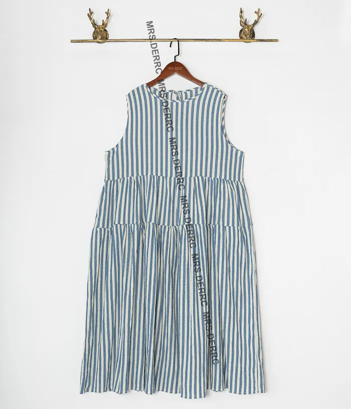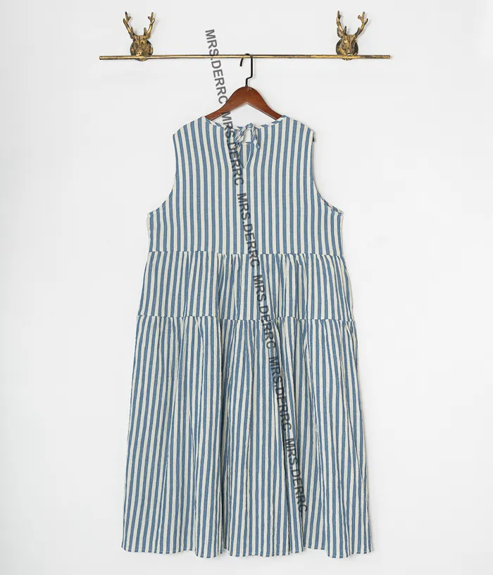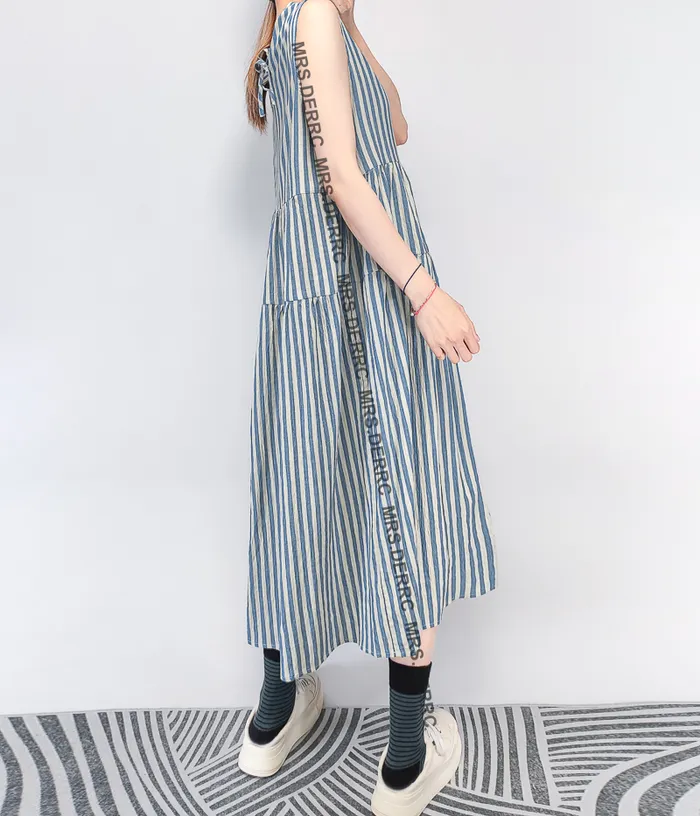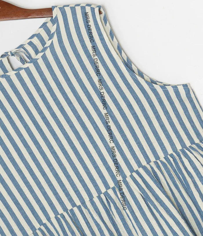 棉質微皺後綁帶條紋層次口袋背心洋裝(藍條)