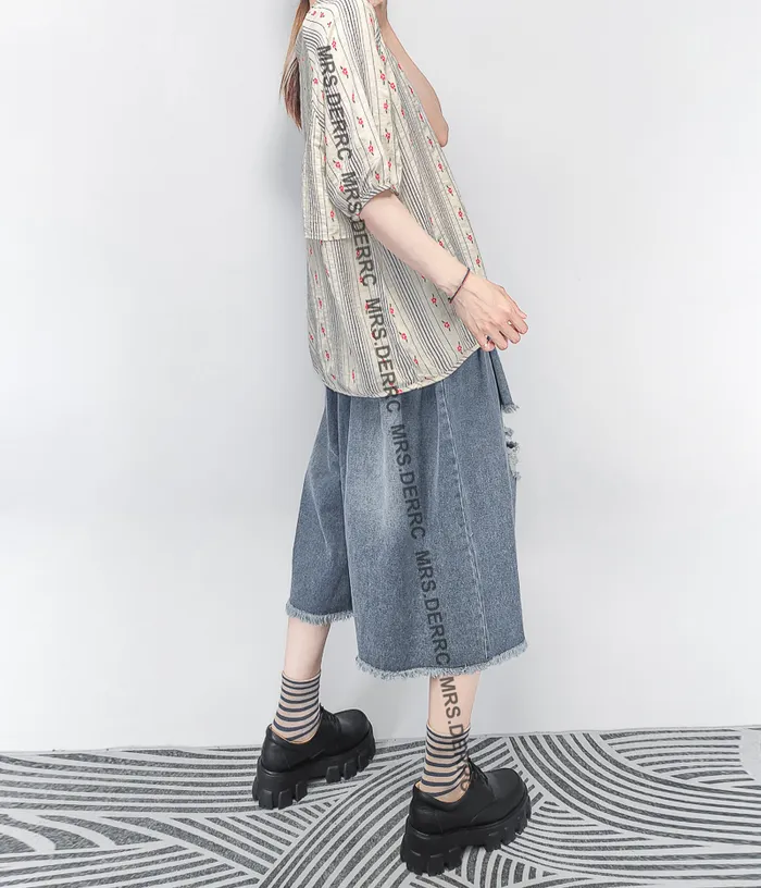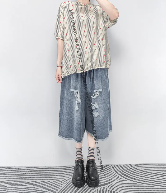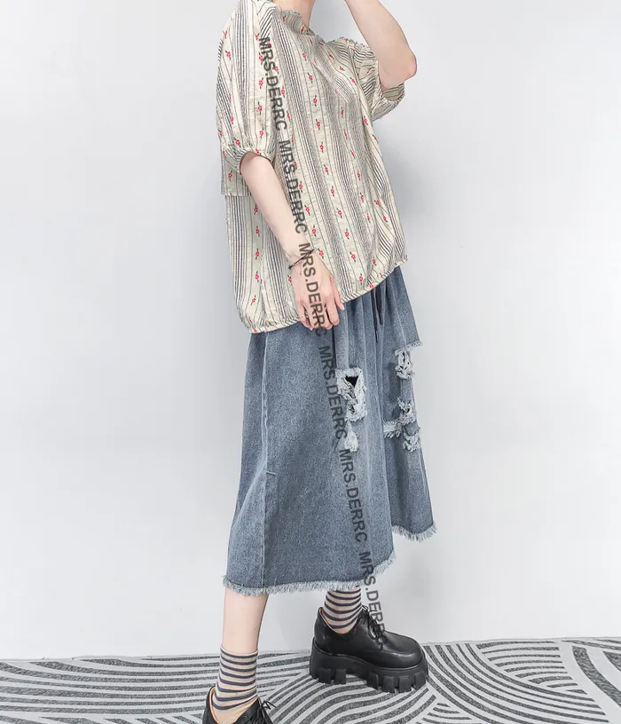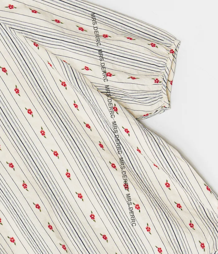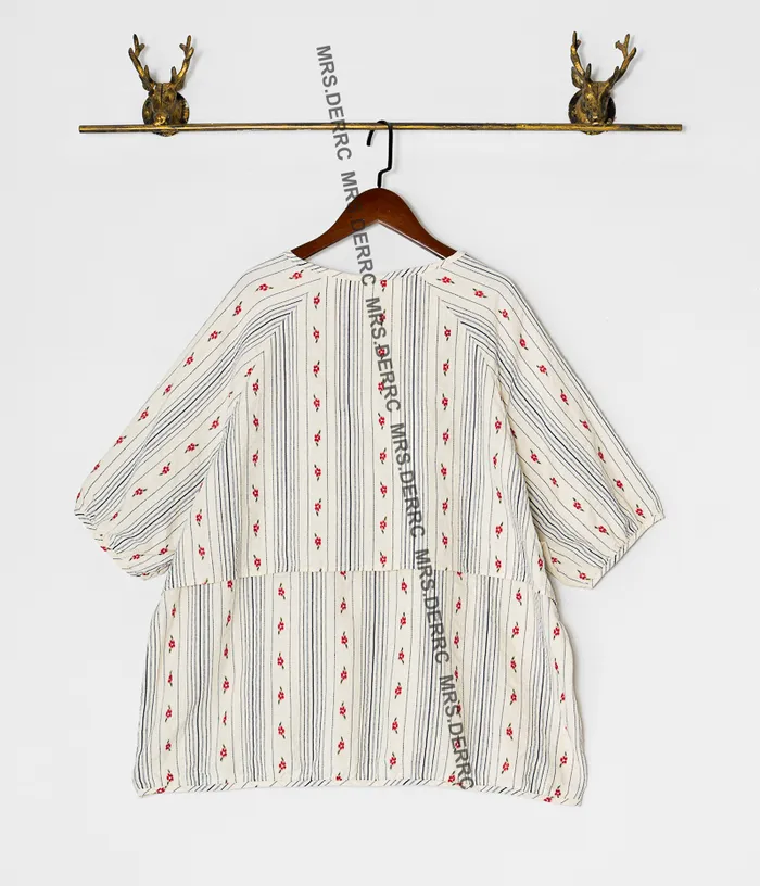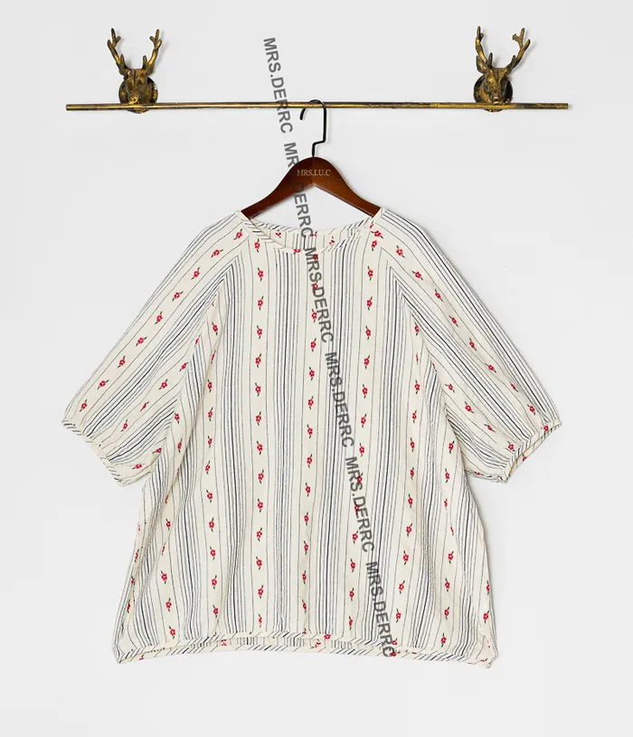 棉質微皺條紋後拼接小紅花上衣(杏色)
