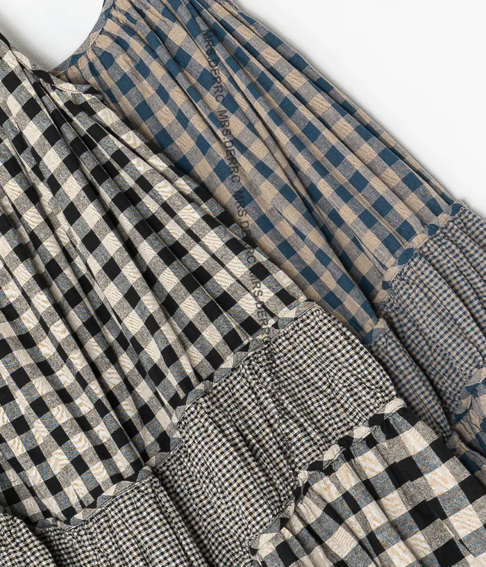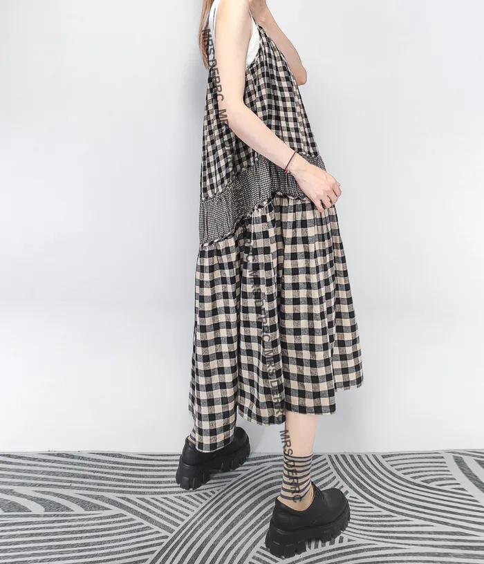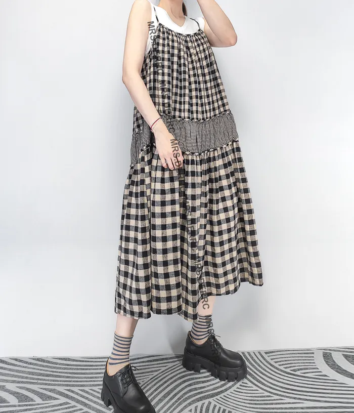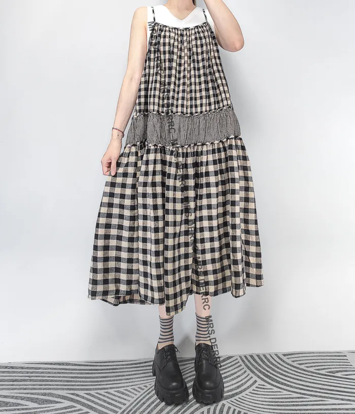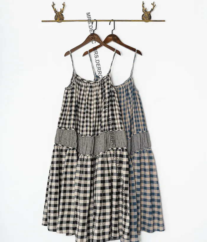 棉質大小格拼接層次細肩帶洋裝(黑格)