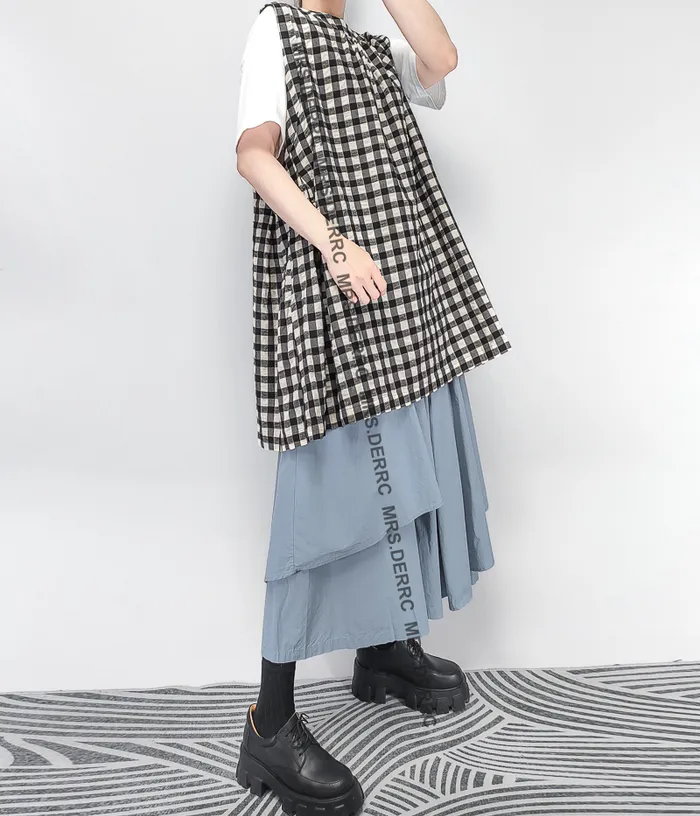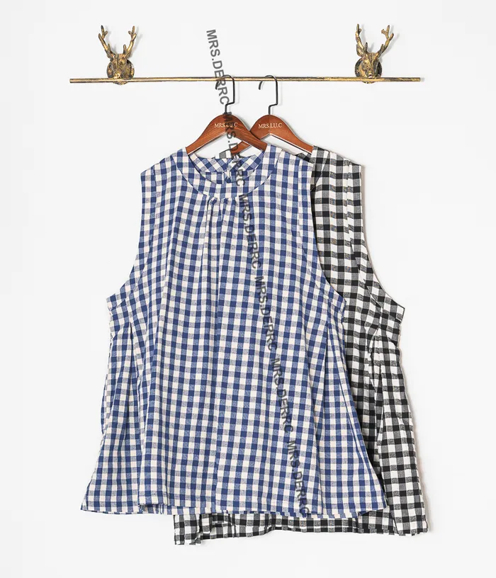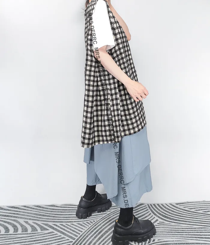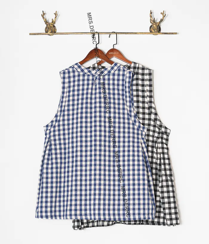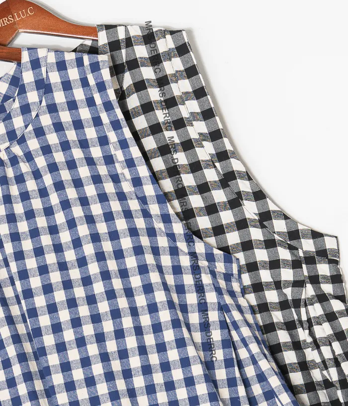 棉質微皺格紋後開釦無袖長上衣(黑格)
