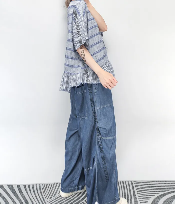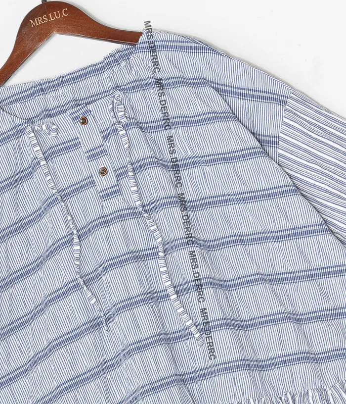 棉質微皺下擺拚接領抽繩條紋上衣(藍條)