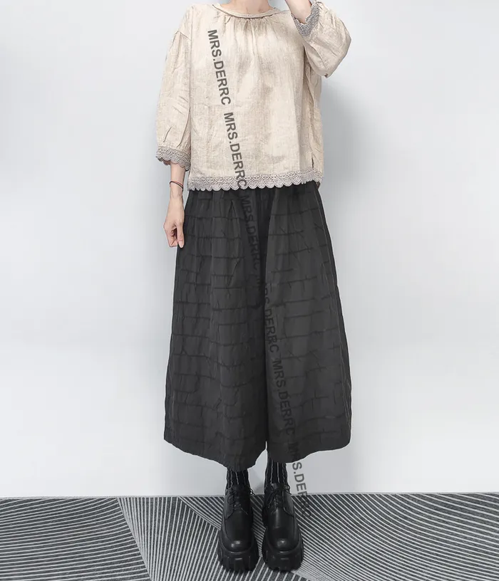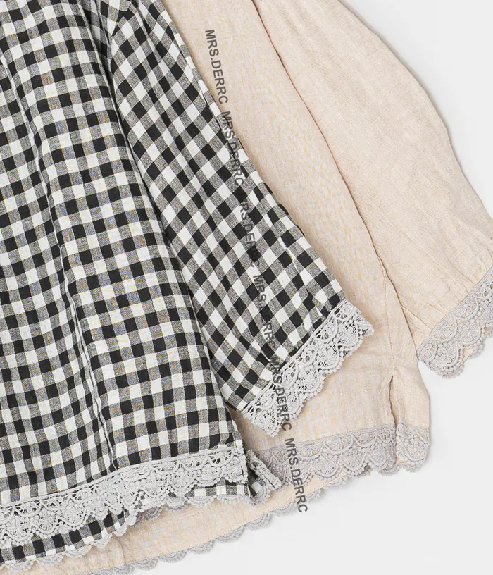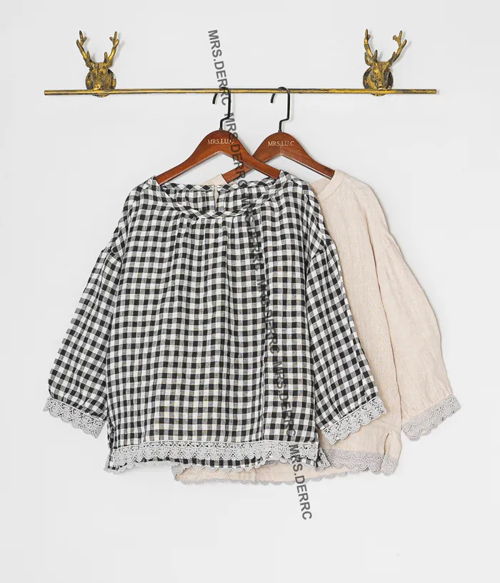 麻料蕾絲滾邊後開釦七分上衣(杏色)