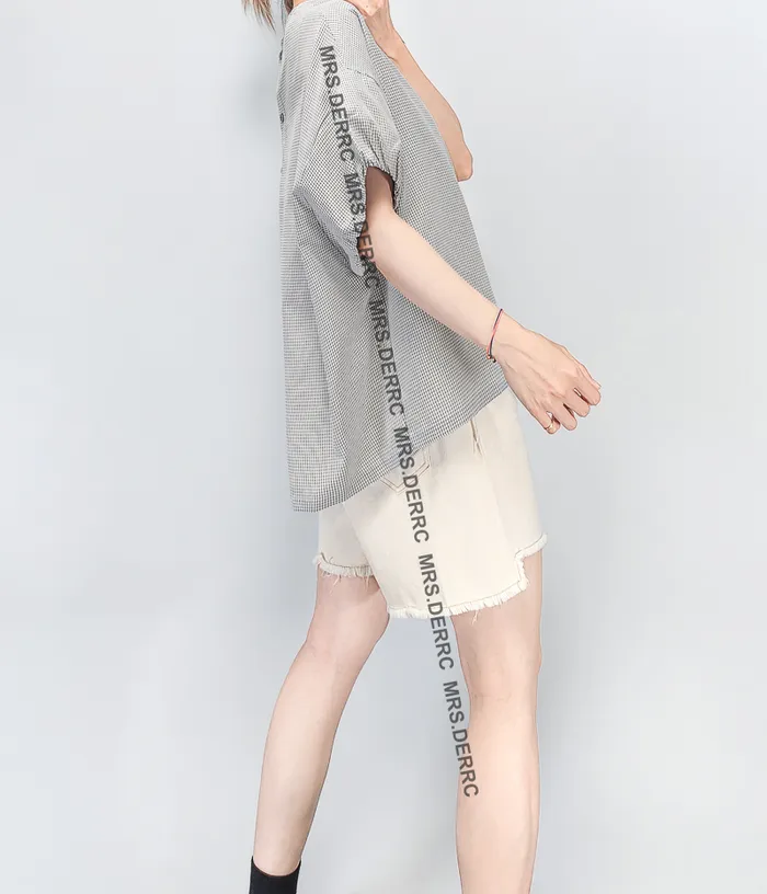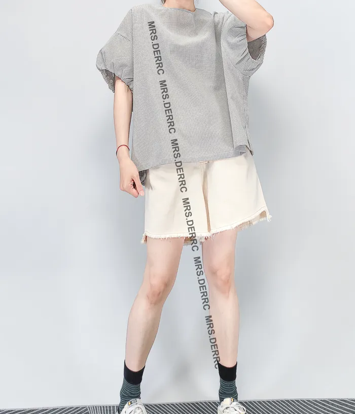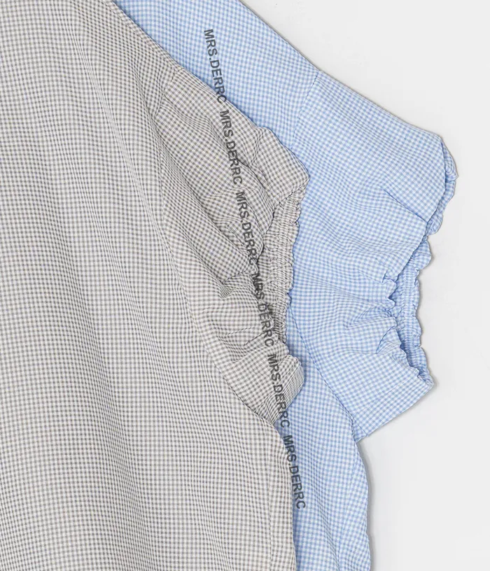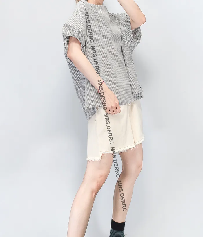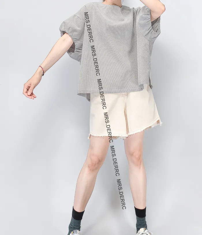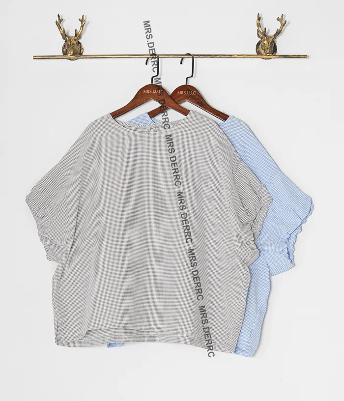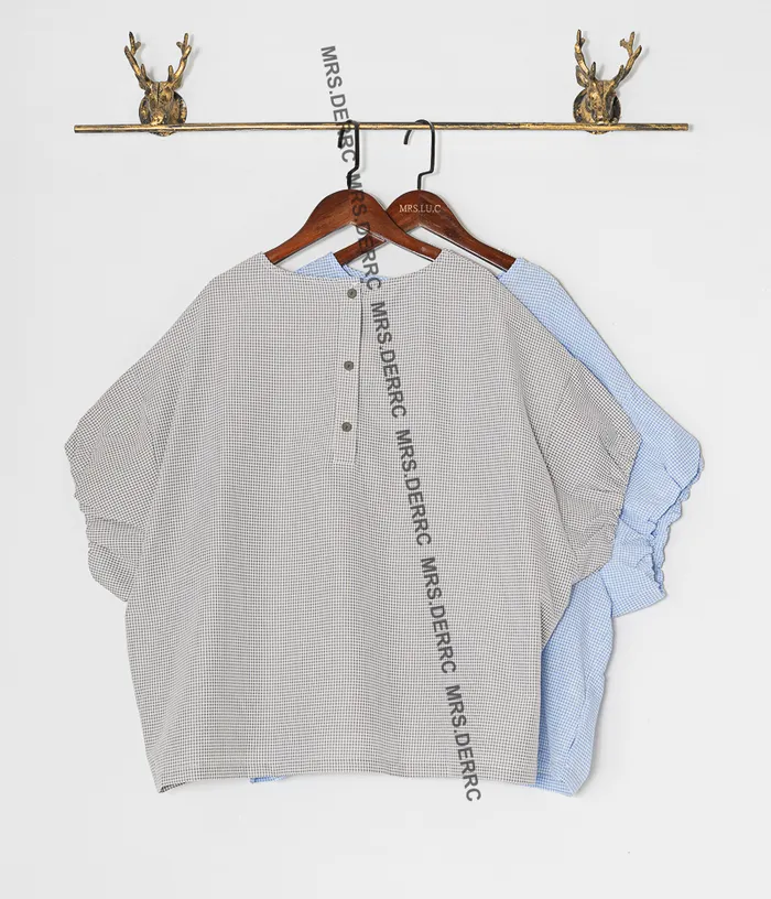 棉混紡微皺小格後開釦袖造型上衣(灰格)