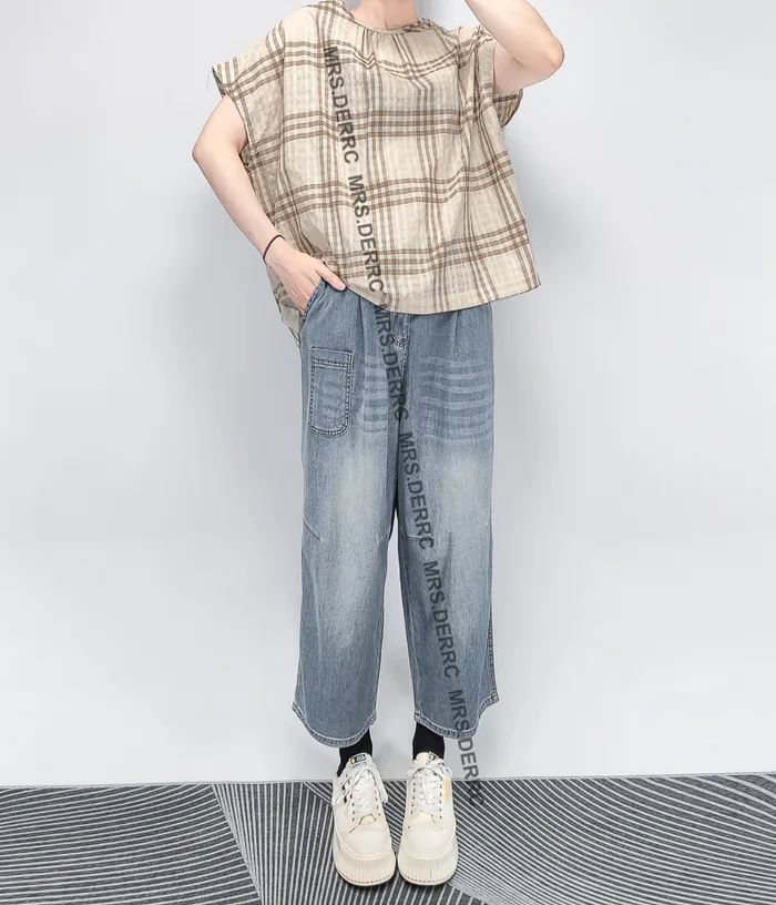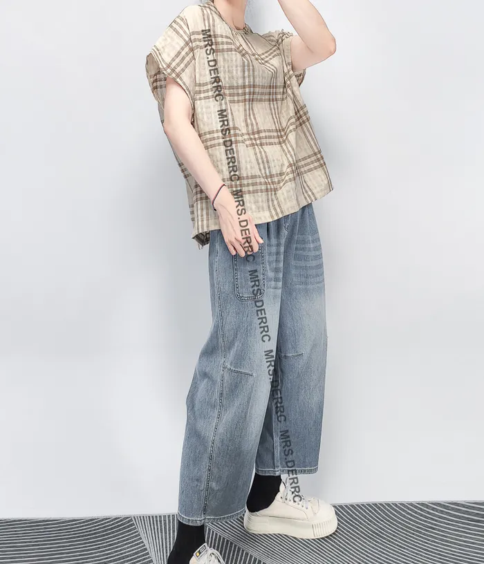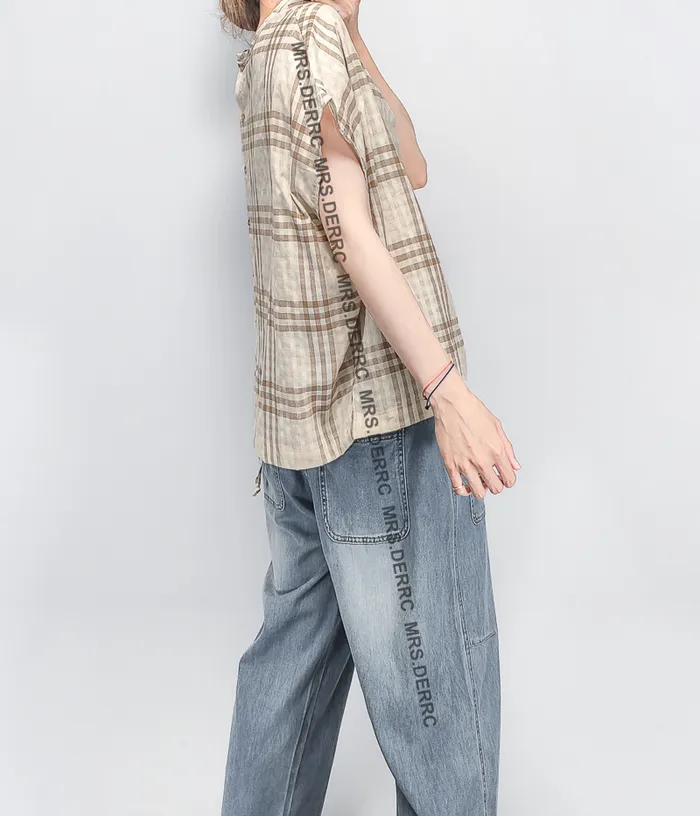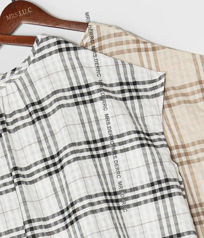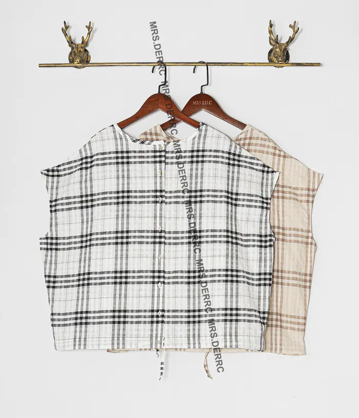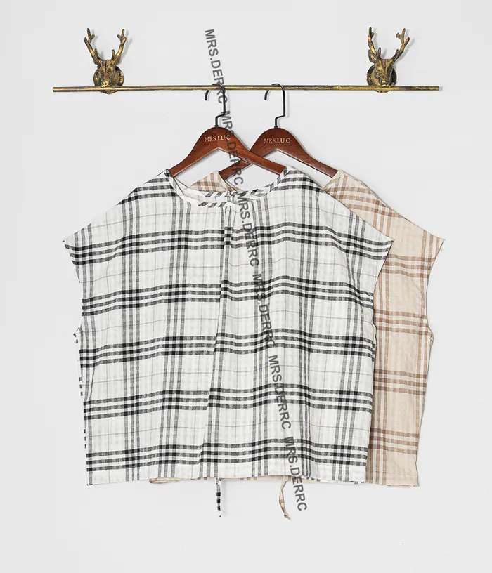 棉質包肩格紋後開釦下抽繩上衣(咖格)
