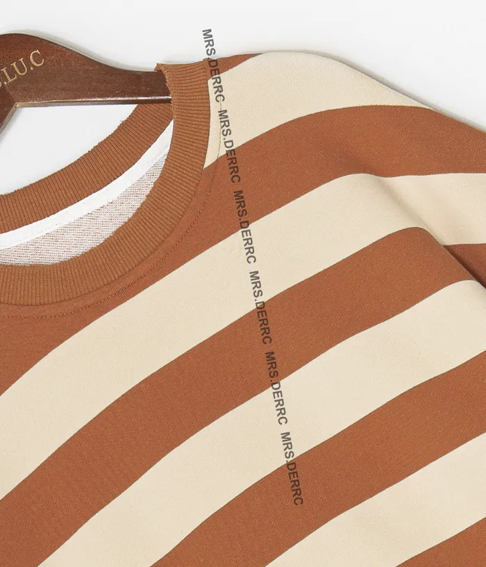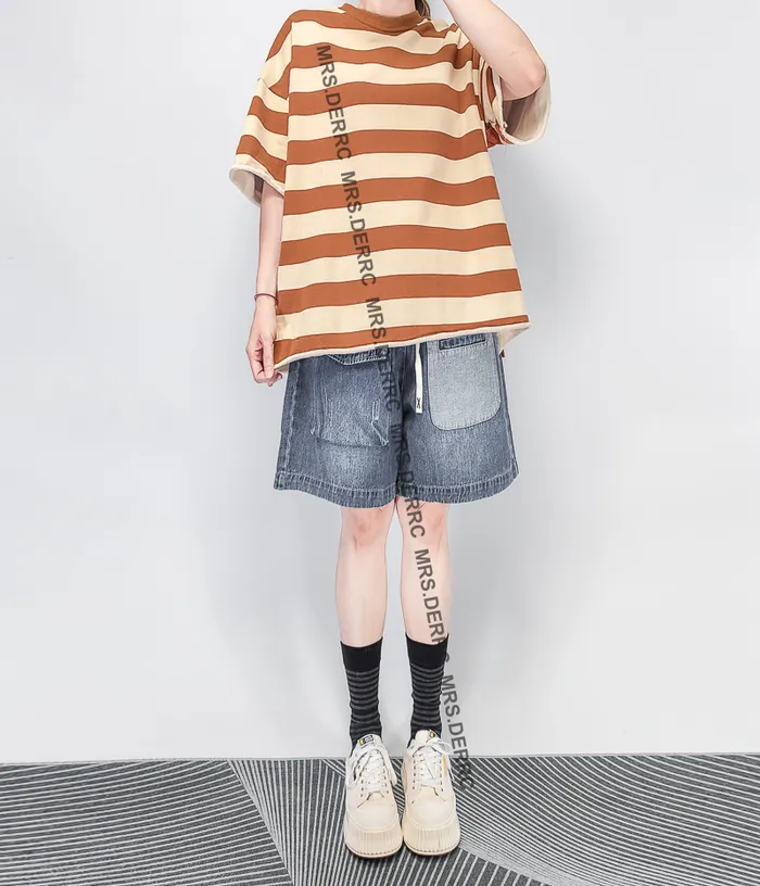 棉質毛巾布領剪破捲邊條紋上衣(咖條)