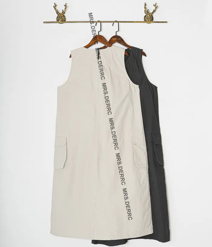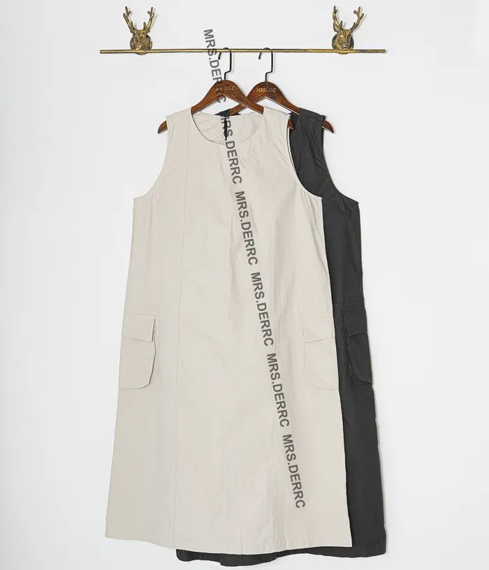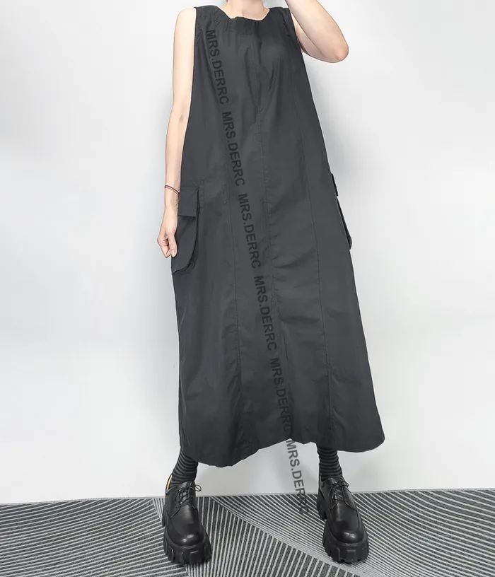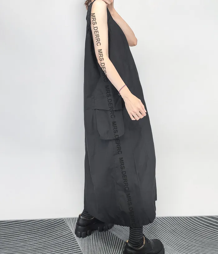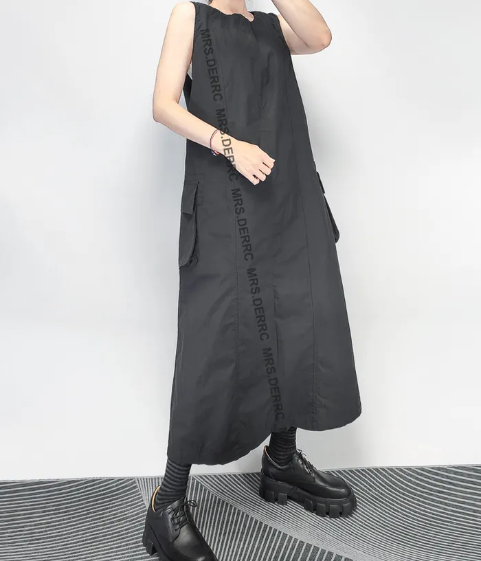 棉質後開釦無袖剪裁口袋洋裝(黑色)
