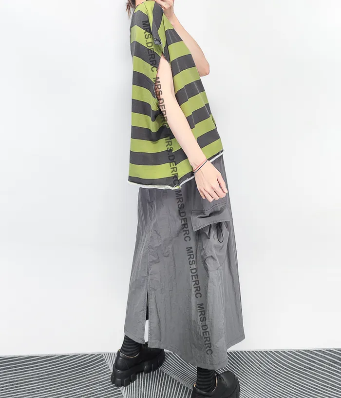 棉質包肩條紋不收邊開釦前後穿上衣(灰綠條)