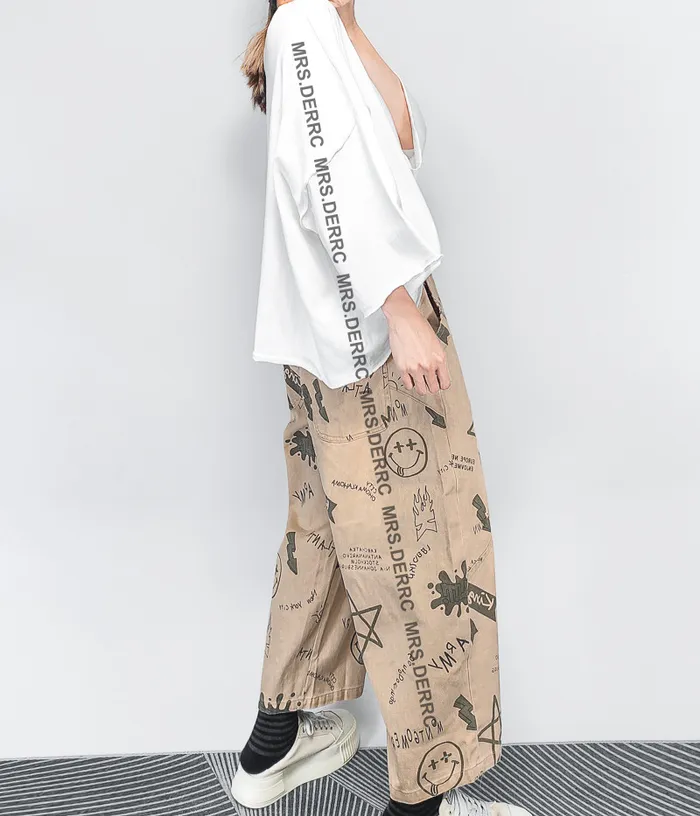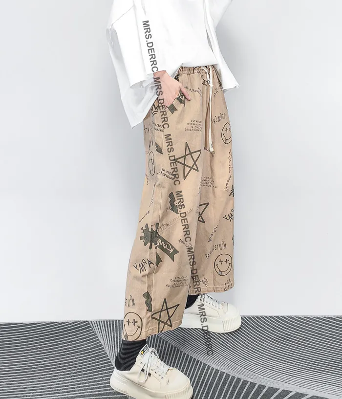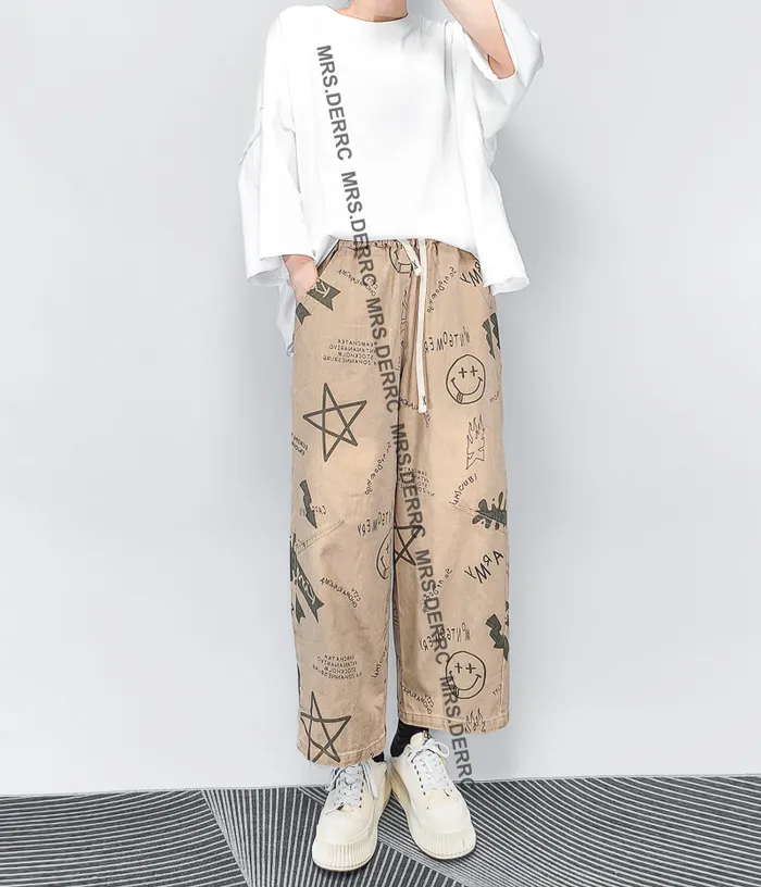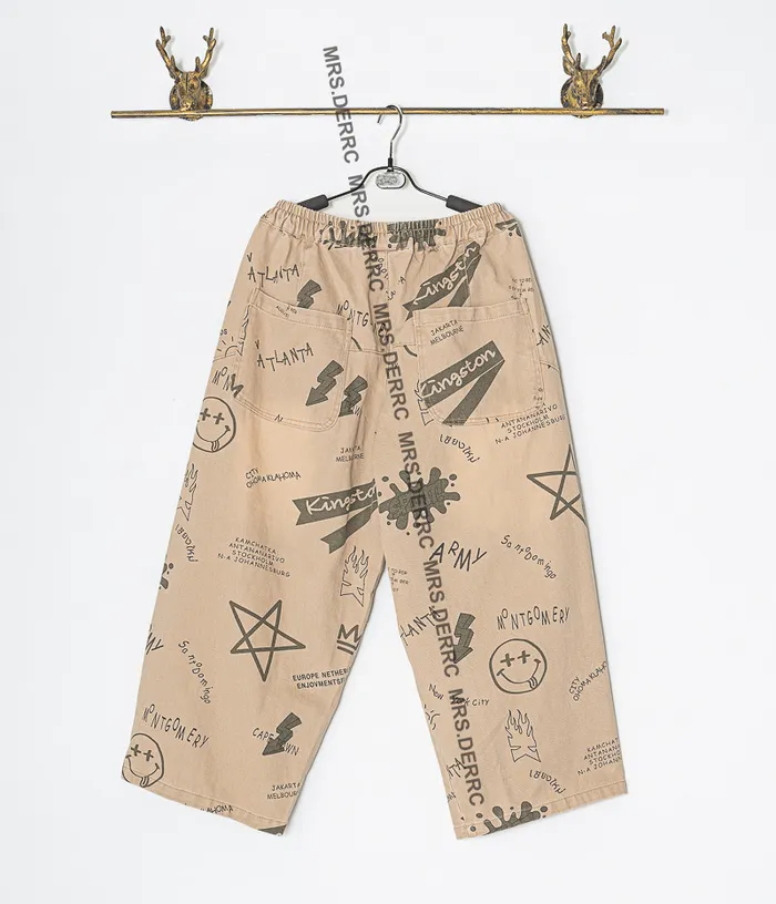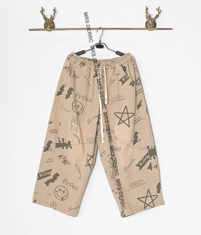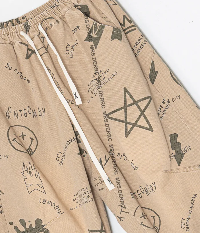 斜紋水洗塗鴉抽繩口袋褲(卡其)