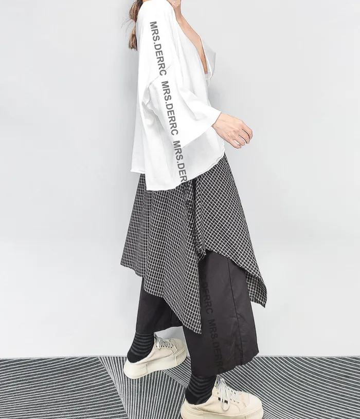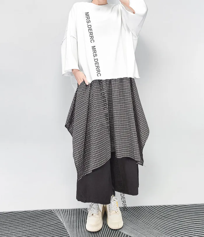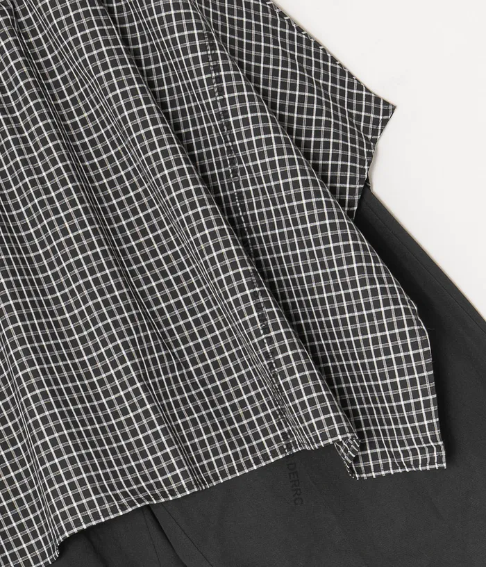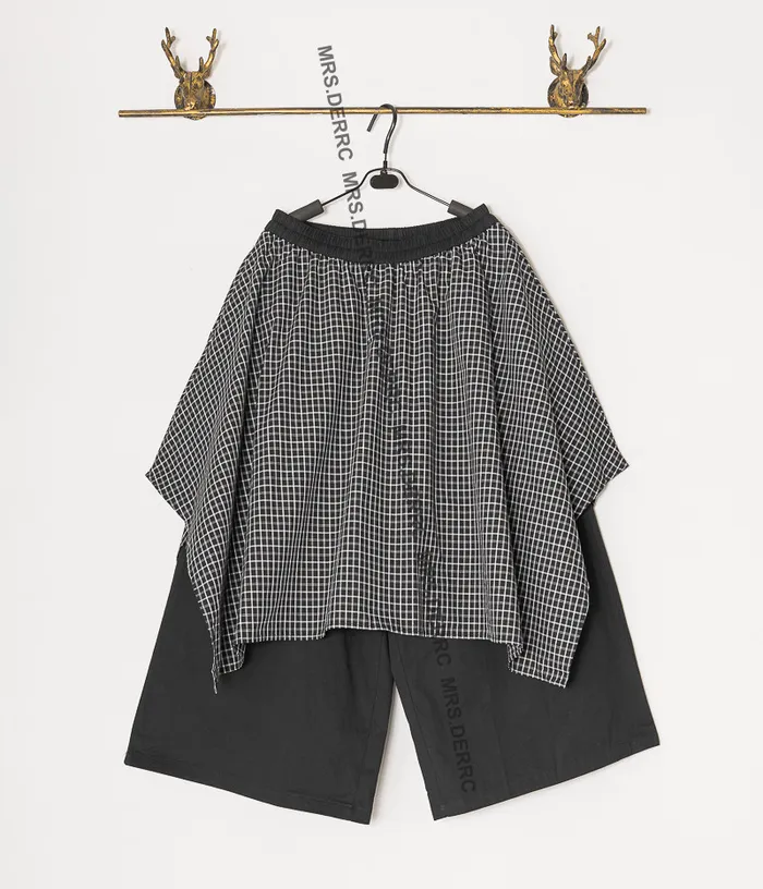 棉混紡不規則裙襬假兩件口袋褲(黑格)