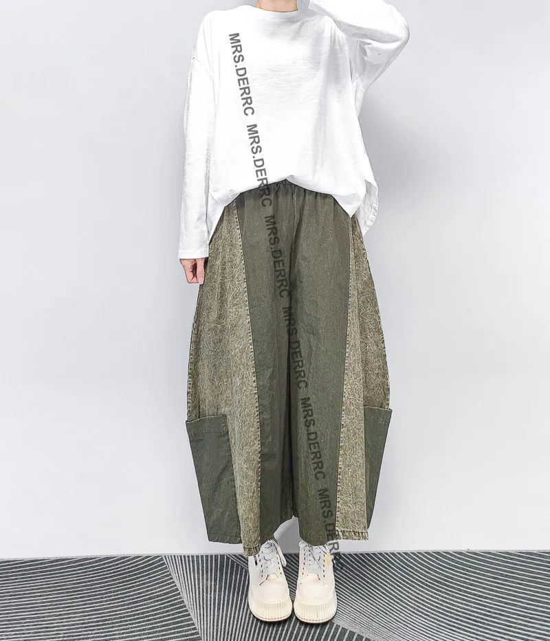 棉混紡水洗拼接造型口袋寬褲(綠色)