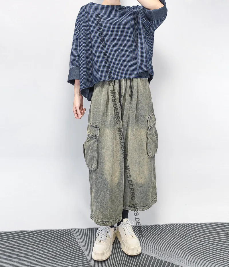 棉混紡雙面格紋拚牛仔寬鬆短版上衣(藍格)