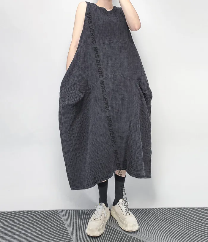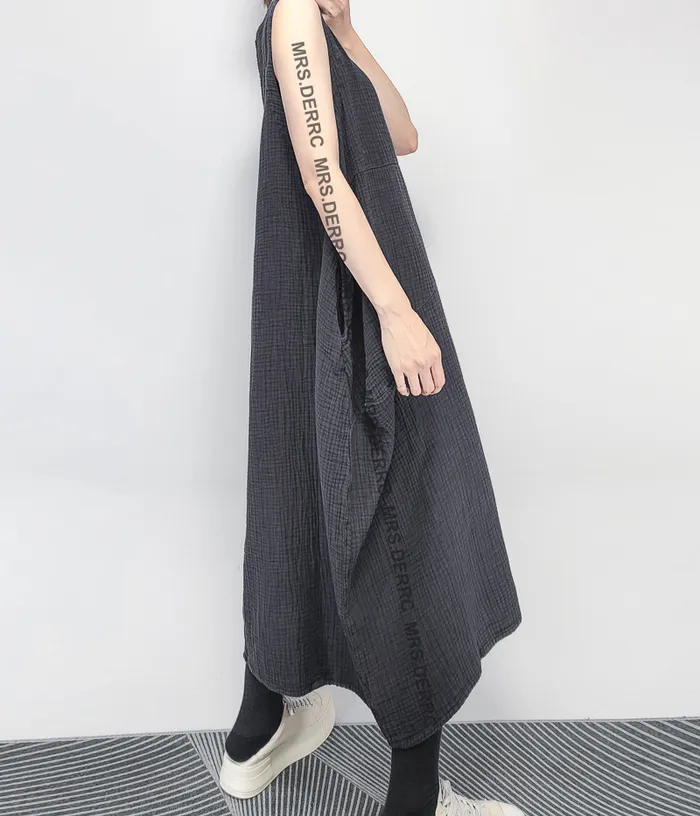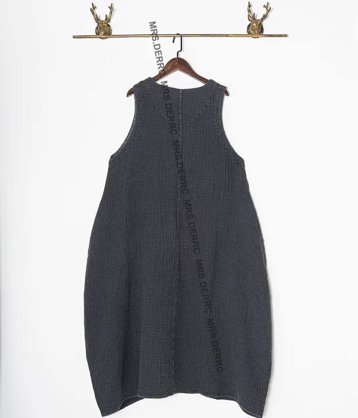棉質水洗微皺格紋造型剪裁無袖口袋洋裝(藍色)