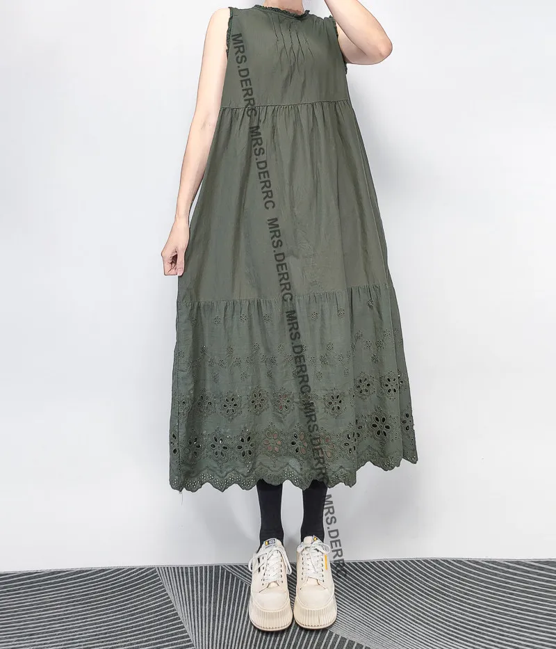棉混紡刺繡蕾絲拚接下襬後開扣無袖口袋洋裝(三色)