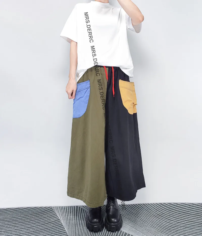 挺棉撞色拼接開扣半鬆緊口袋寬褲(黑色)