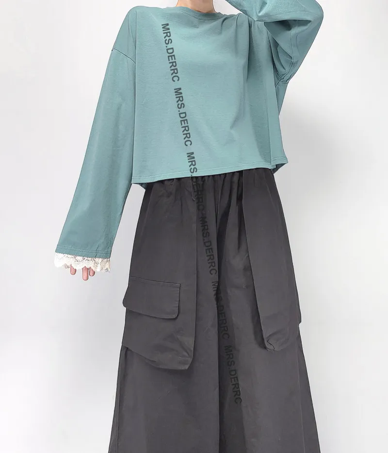 棉質袖拚蕾絲短版上衣(藍綠)