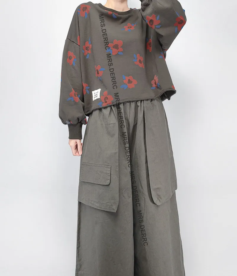 棉質捲邊短版寬鬆小花上衣(灰色)
