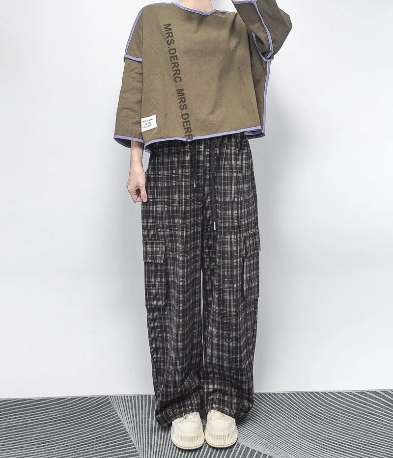 棉混紡微磨毛抽繩格紋口袋寬褲(灰黑格)