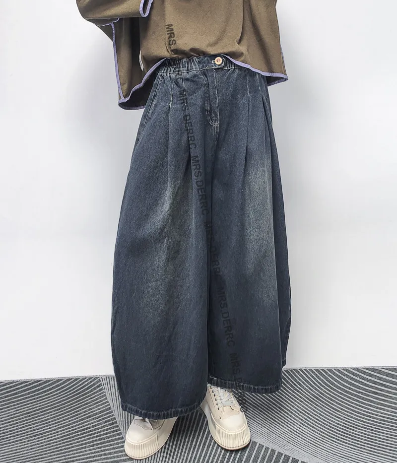 挺布牛仔刷色開釦鬆緊打褶口袋褲