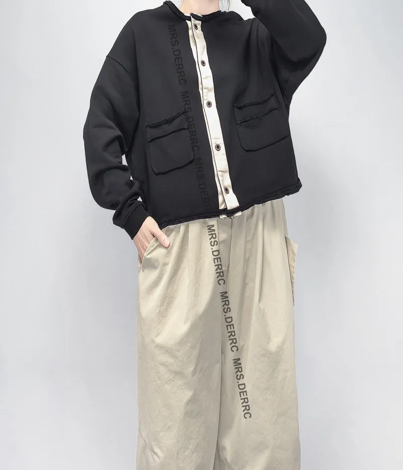 棉質白拚黑捲邊開釦小口袋外套(黑色)