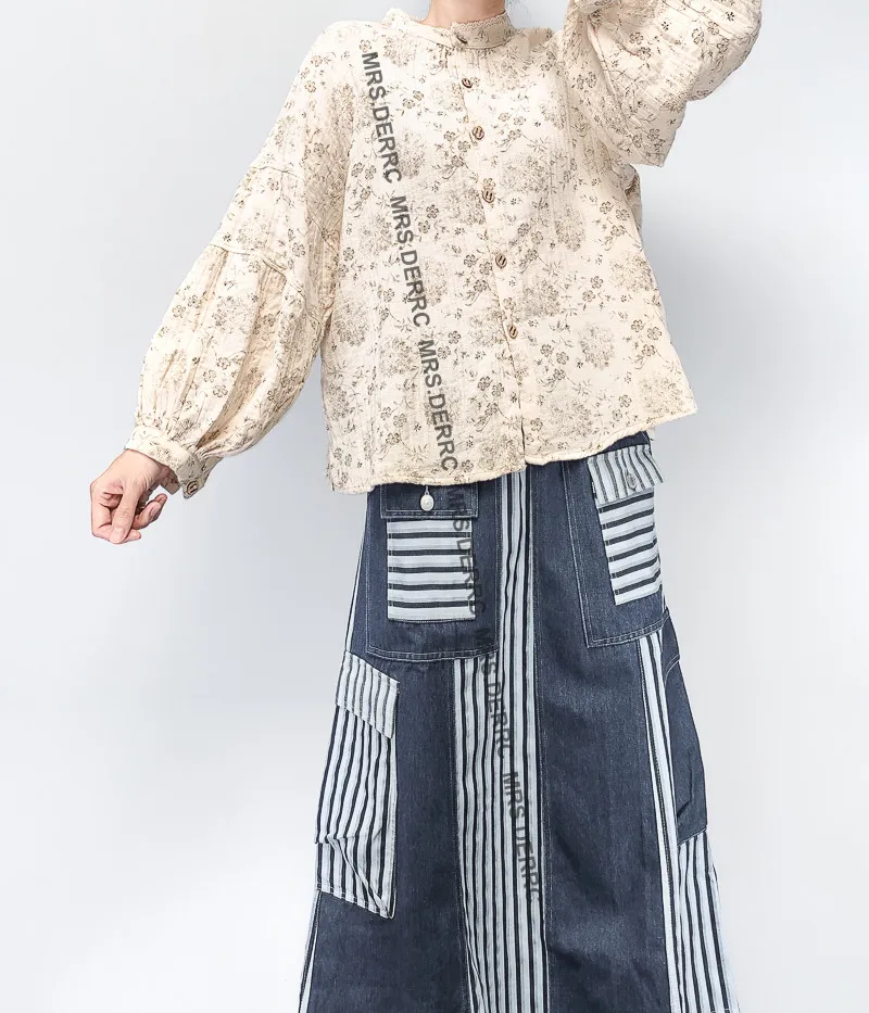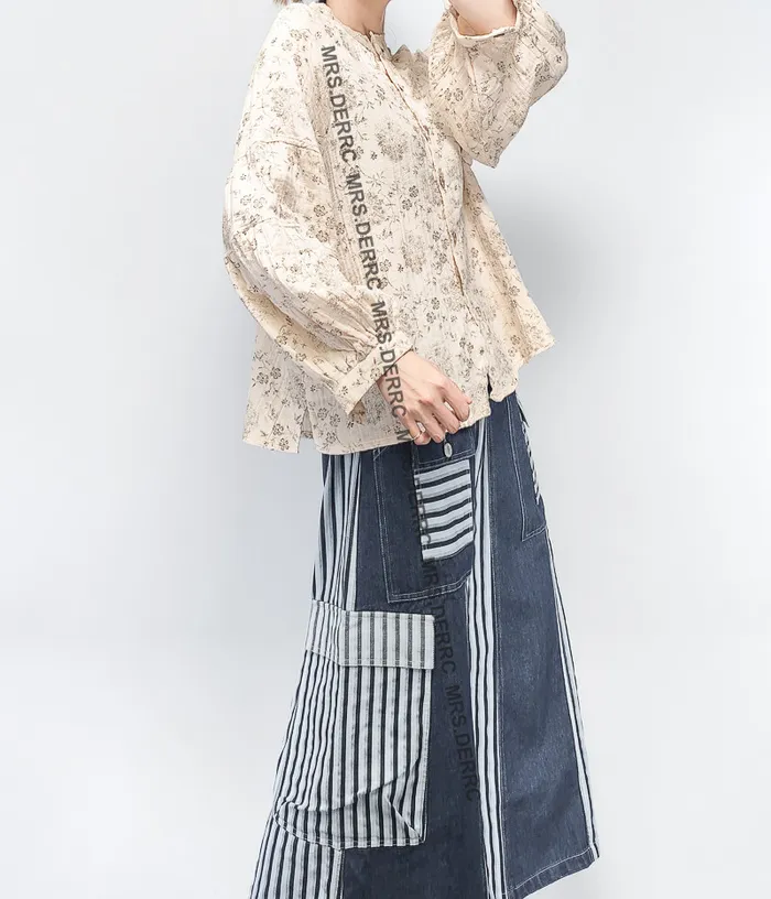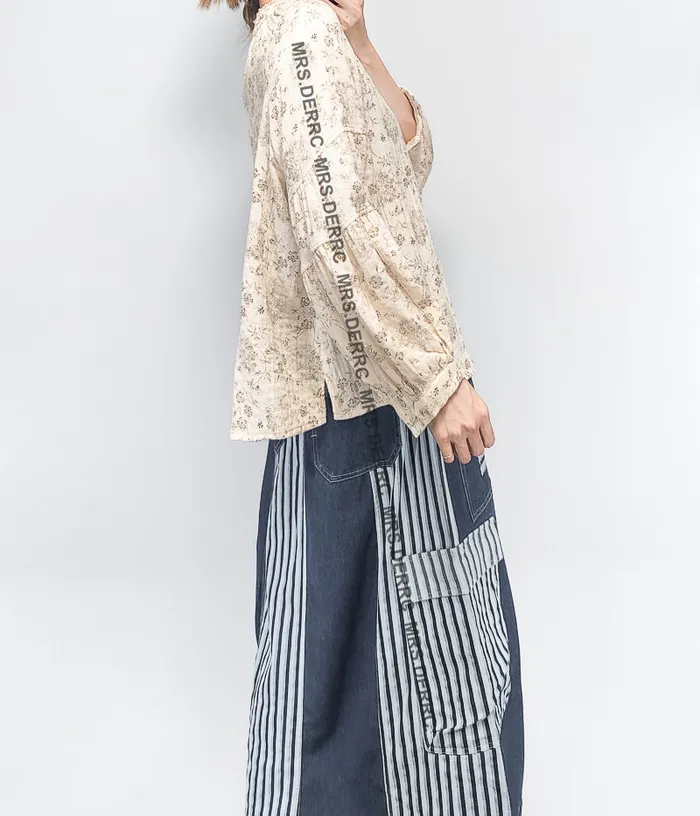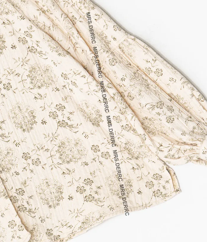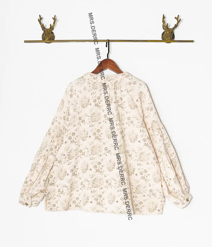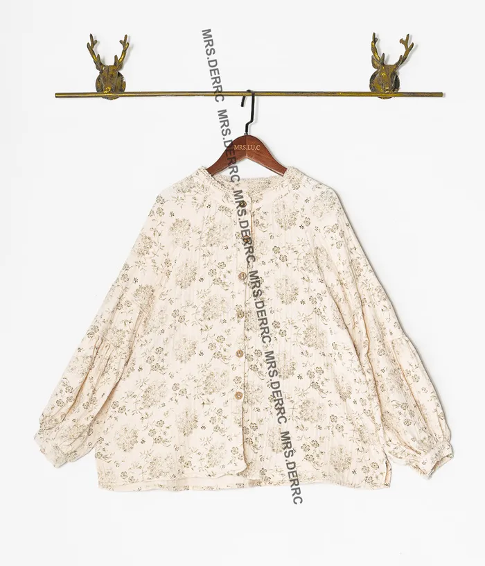 (預購)棉麻造型袖印花木釦上衣(杏色)