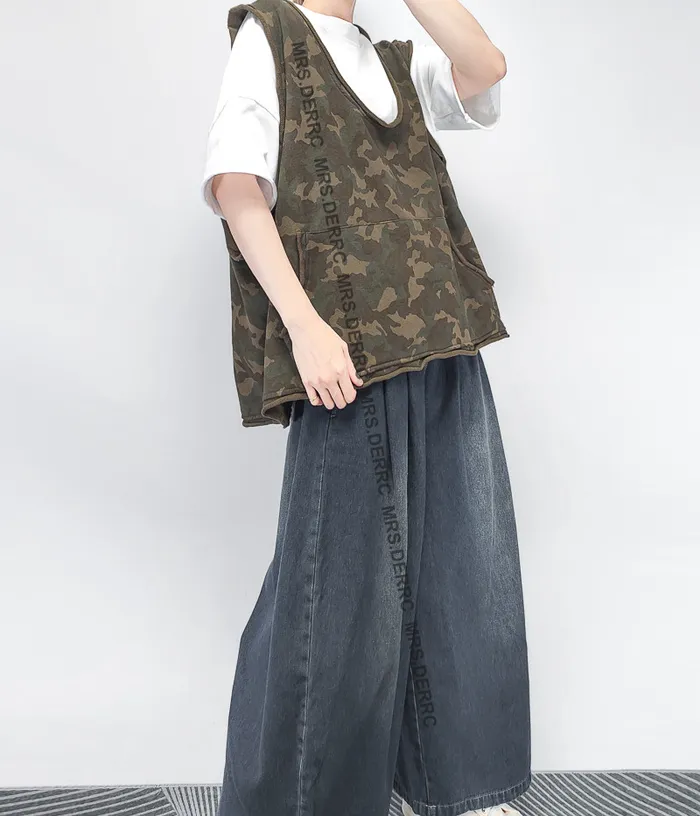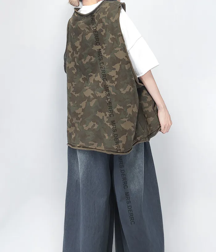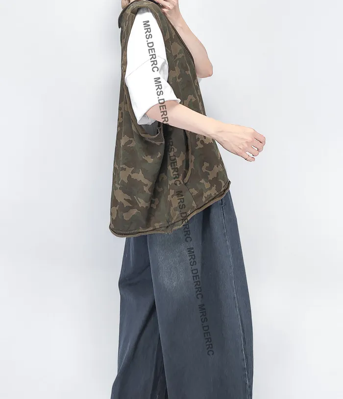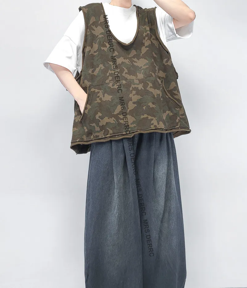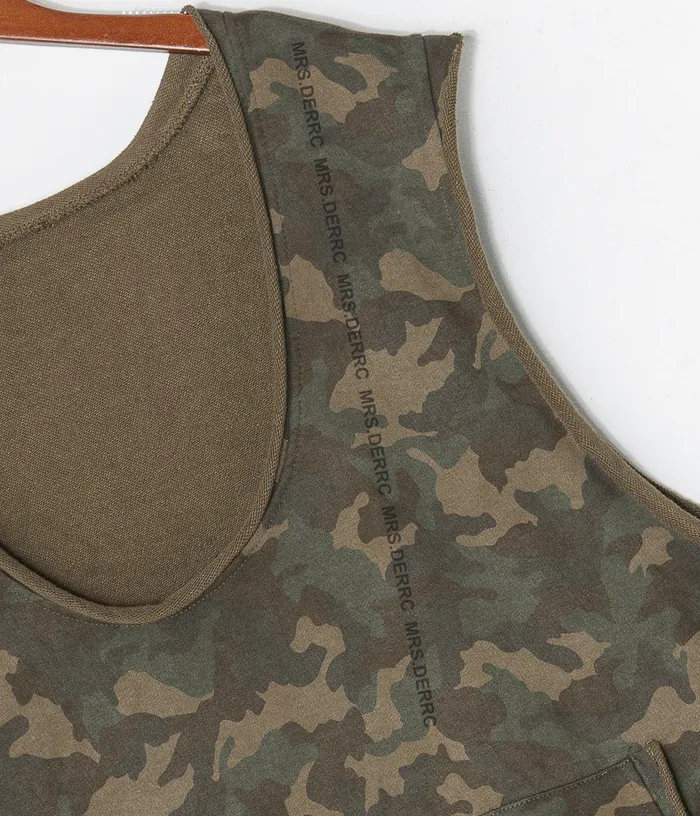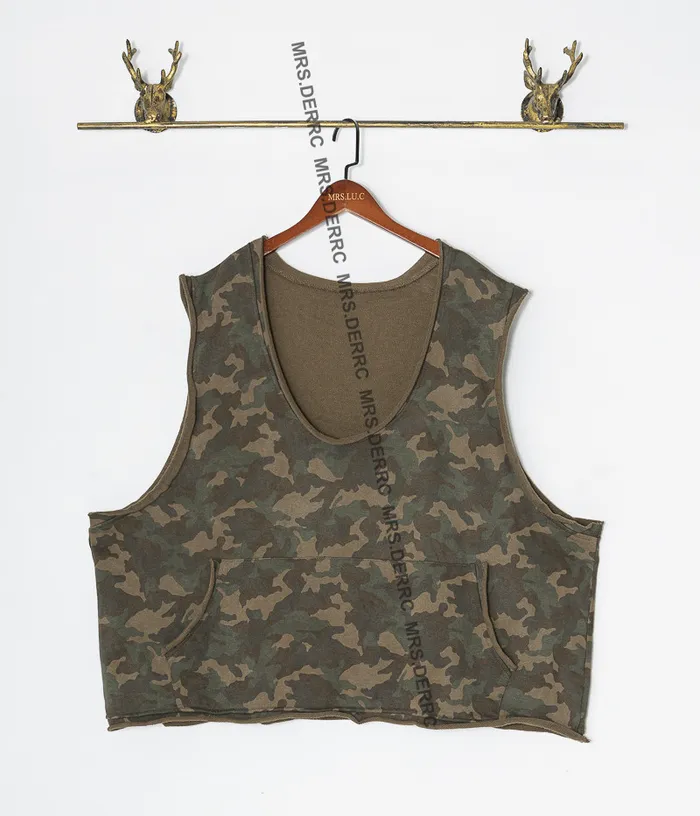 棉質迷彩捲邊大U領寬鬆背心(綠色)