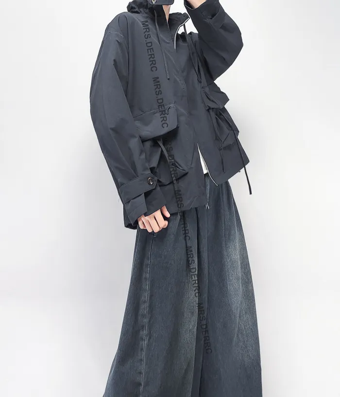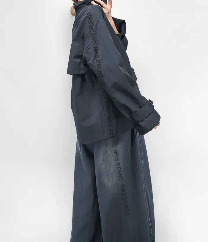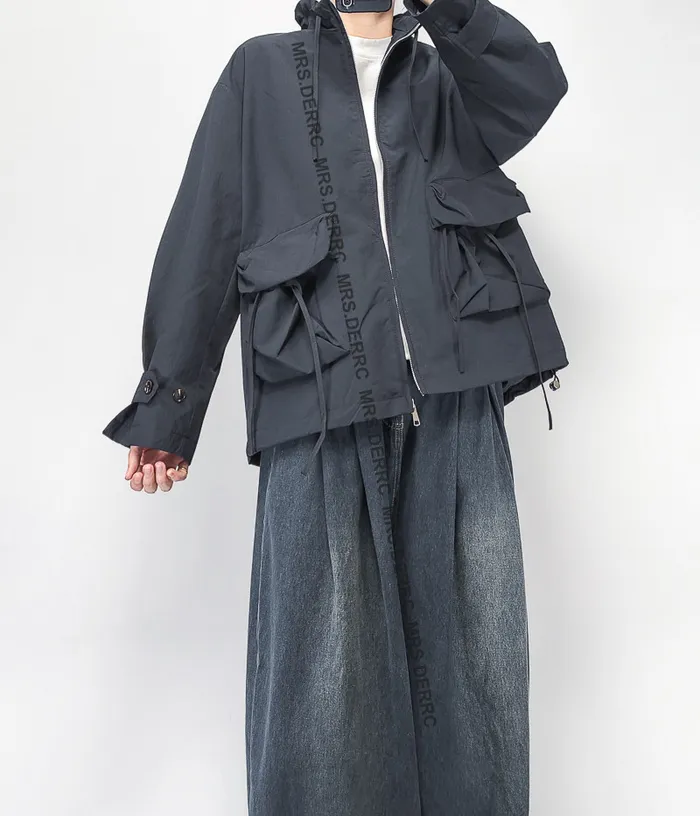 領綁帶造型立體口袋拉鍊外套(藍色)