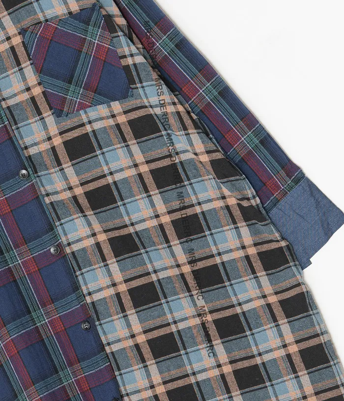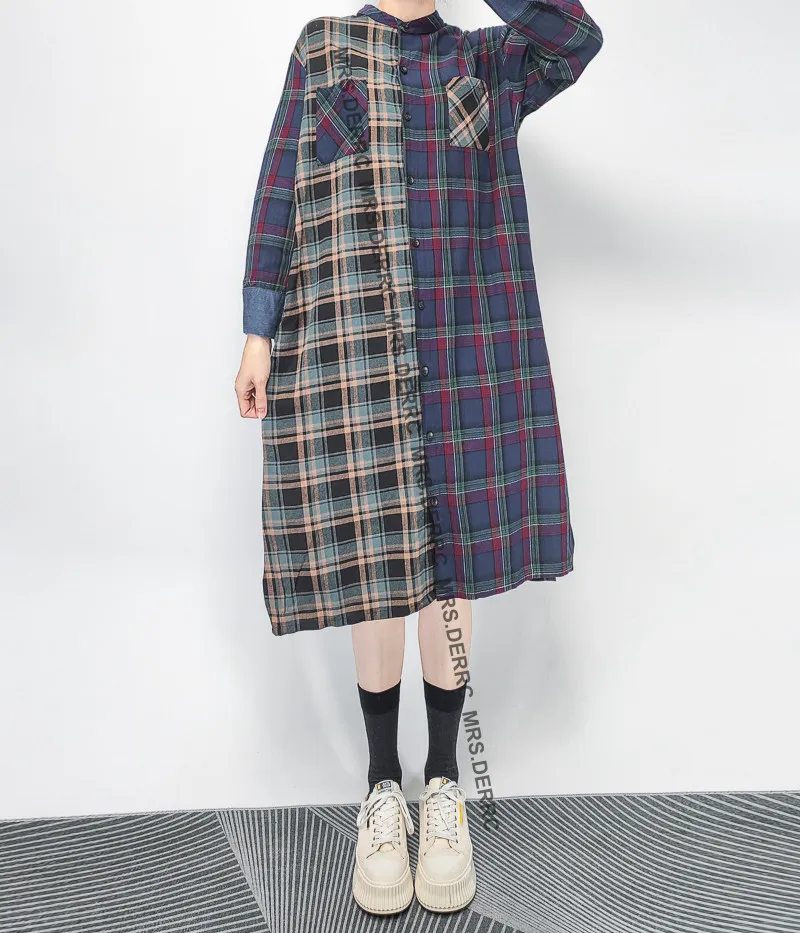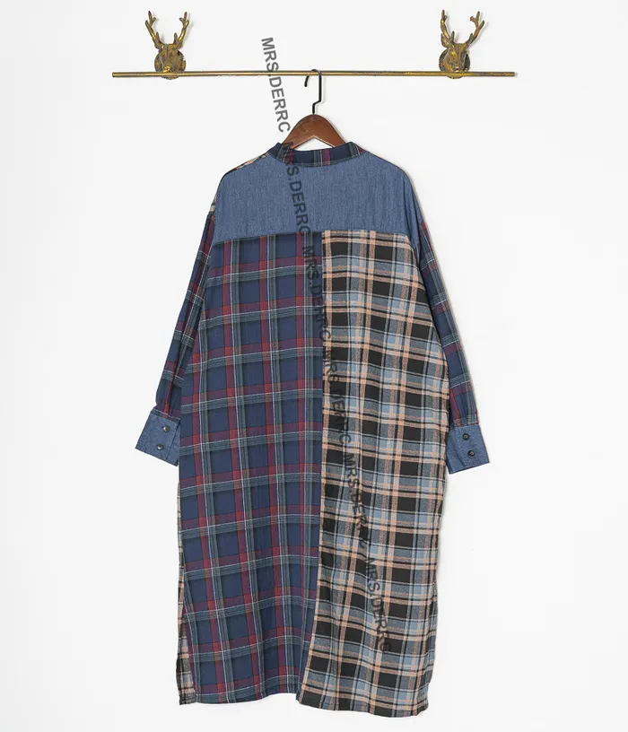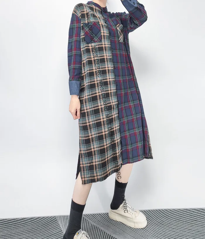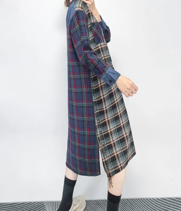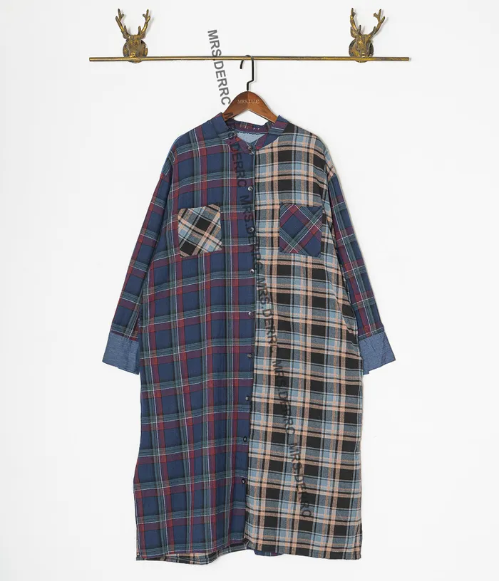棉混紡彩格拼接開釦口袋洋裝(格紋)