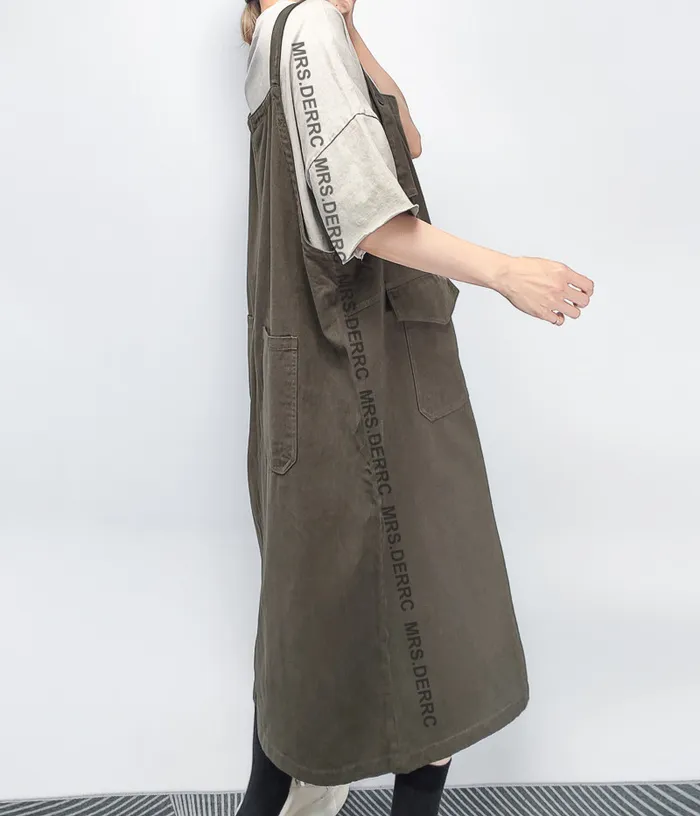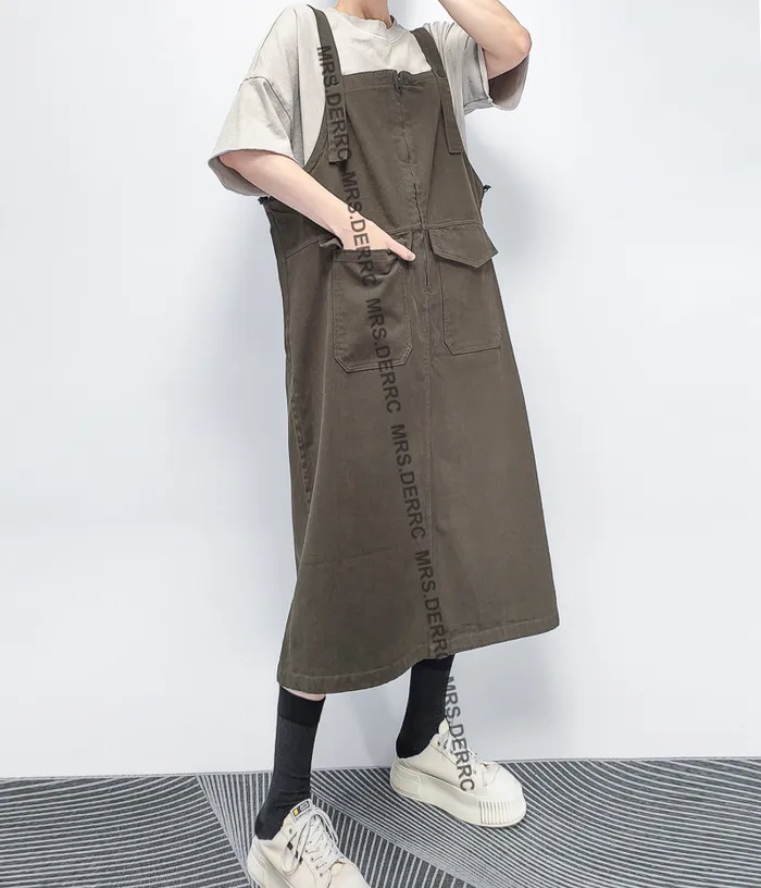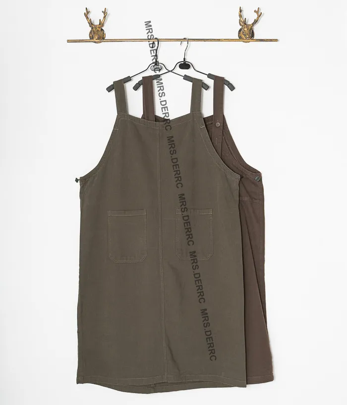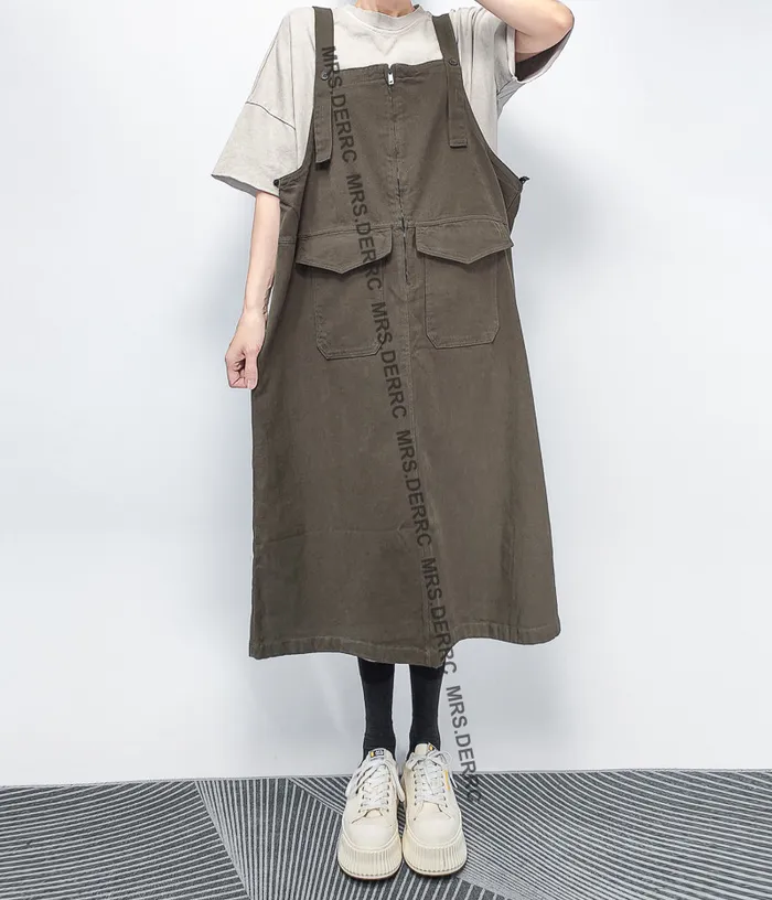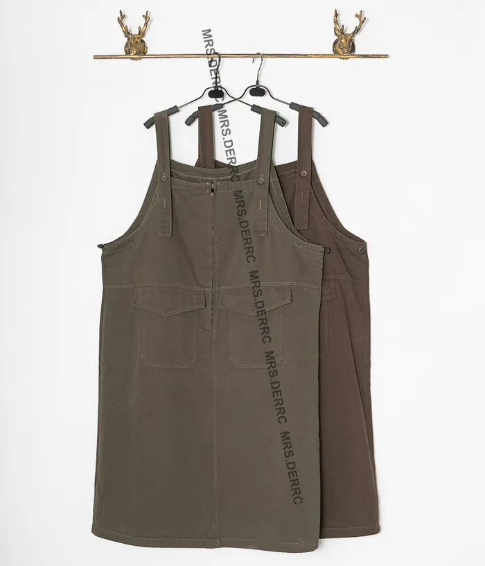 棉混紡斜紋半拉鍊吊帶口袋裙(綠色)