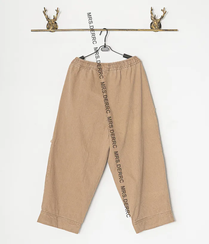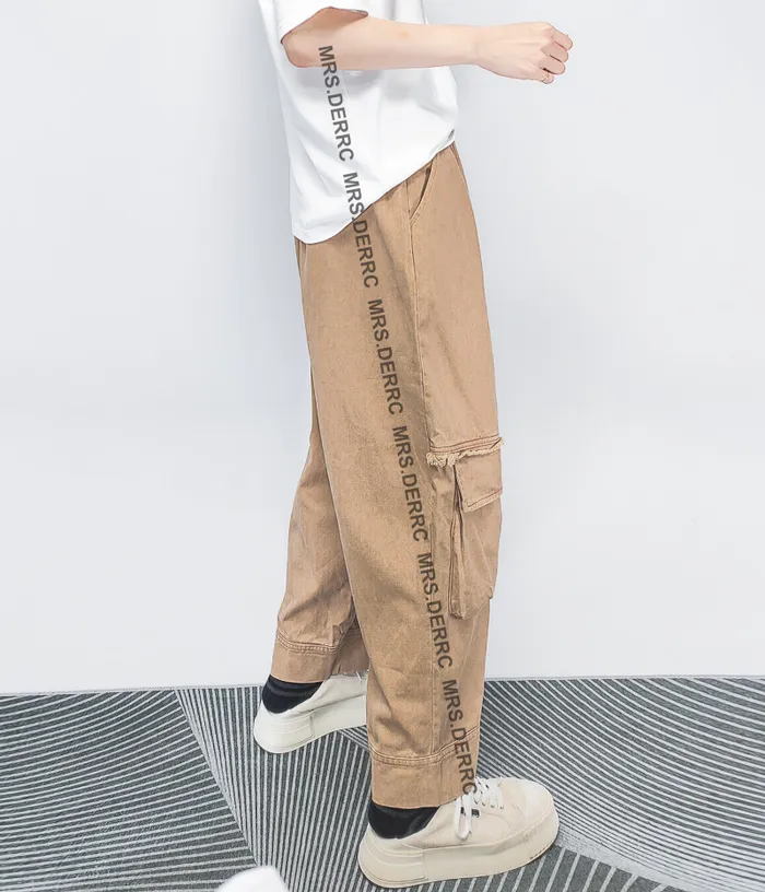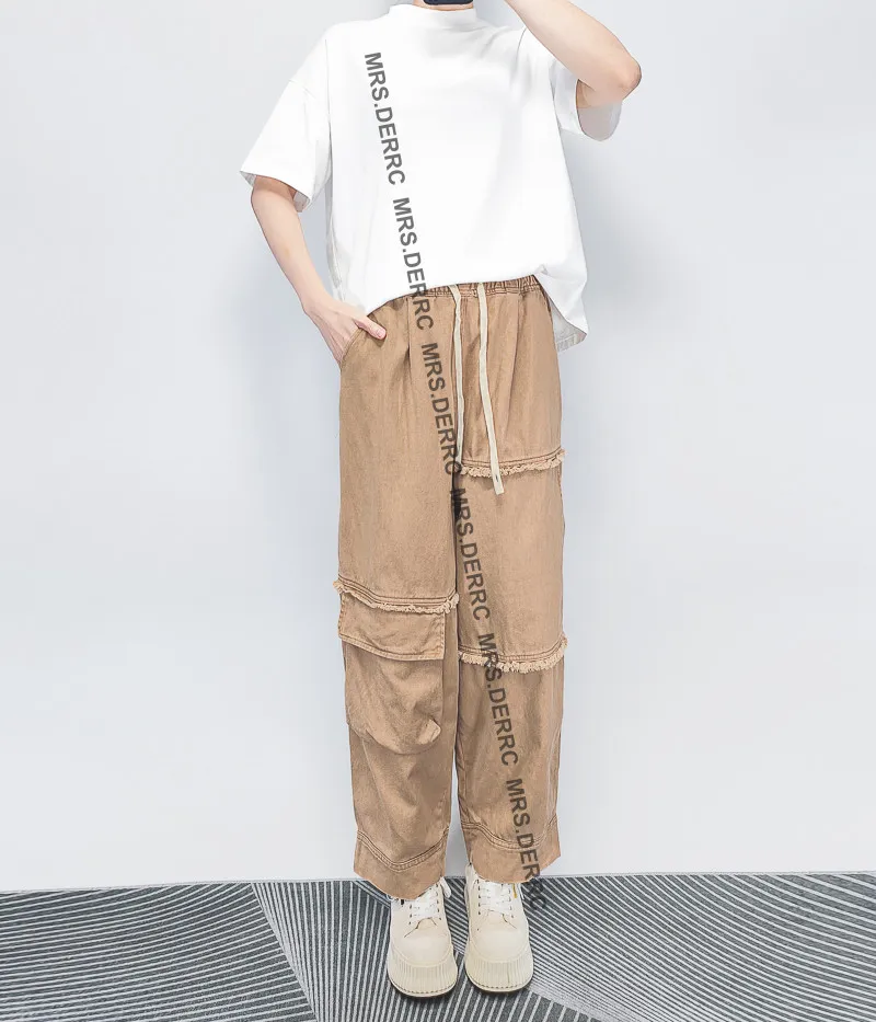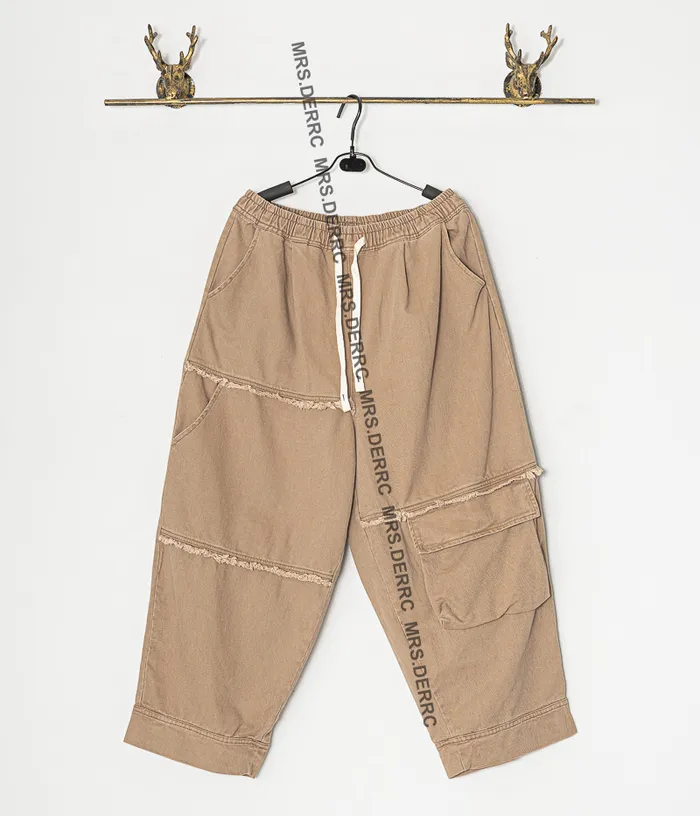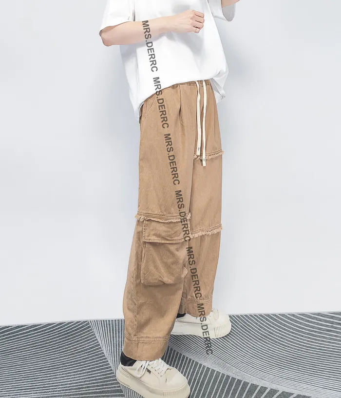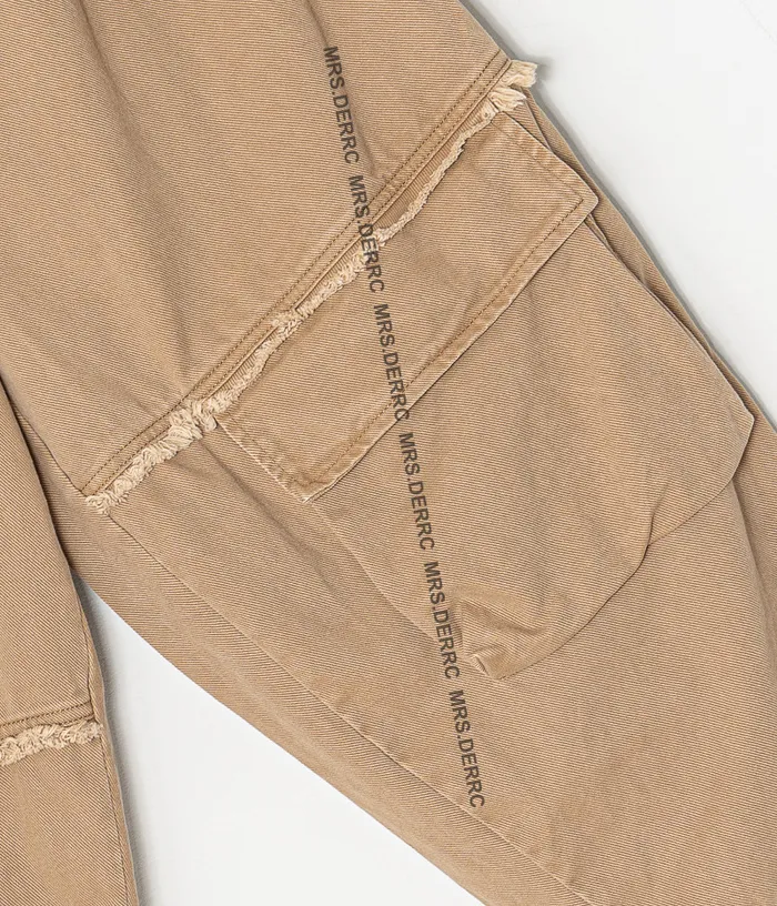 棉混紡水洗不收邊拼接多口袋褲(卡其)