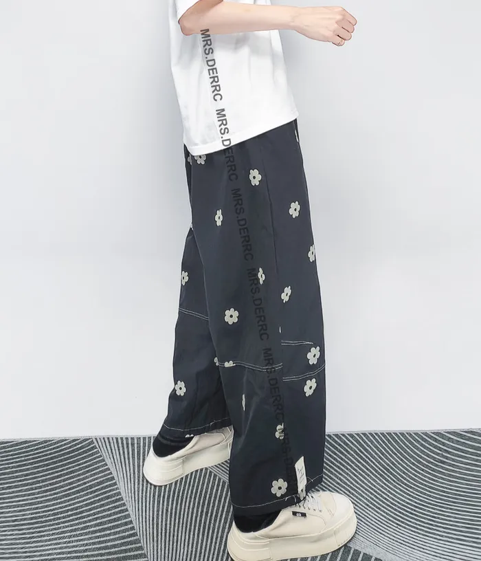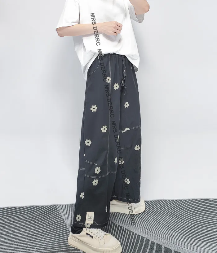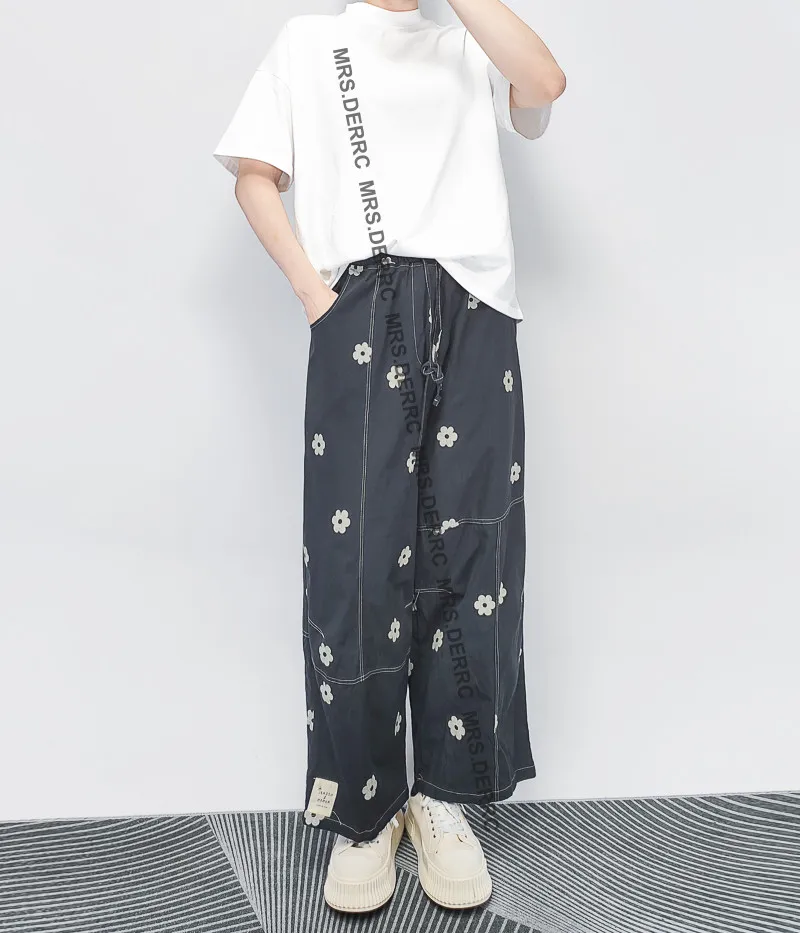 棉混紡縫線花朵抽繩口袋褲(藍色)