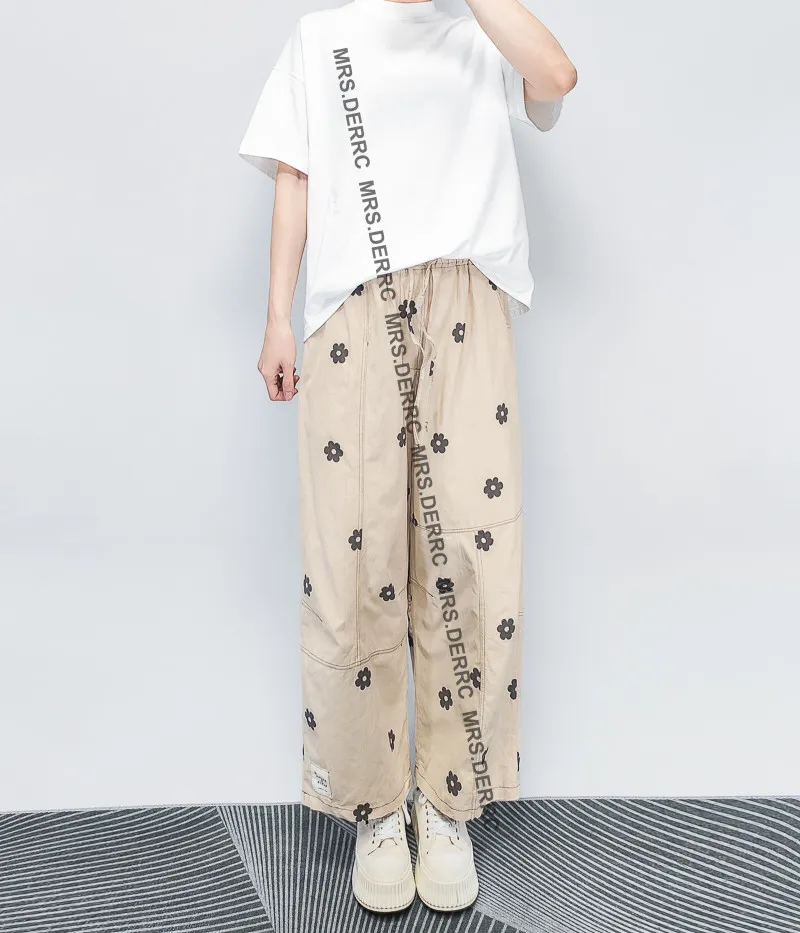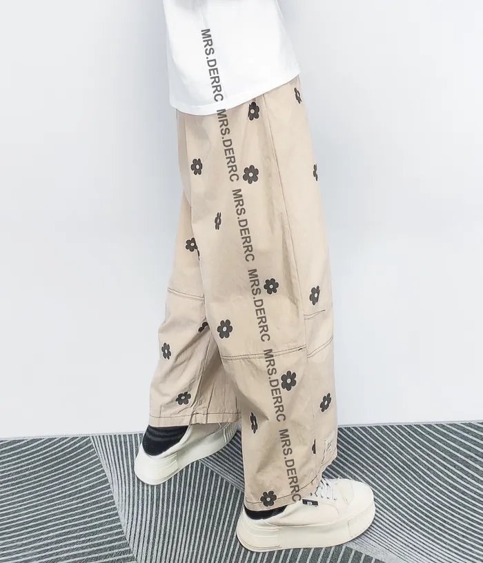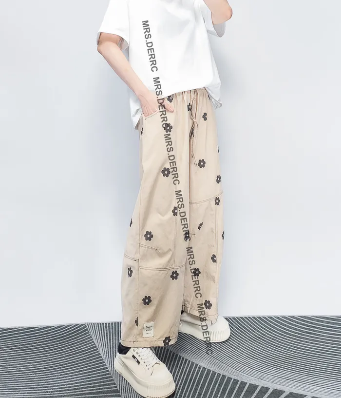 棉混紡縫線花朵抽繩口袋褲(淺卡其)