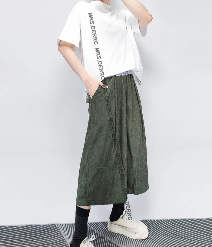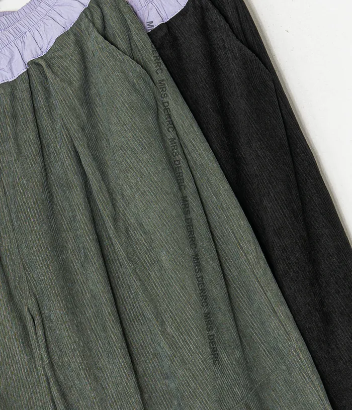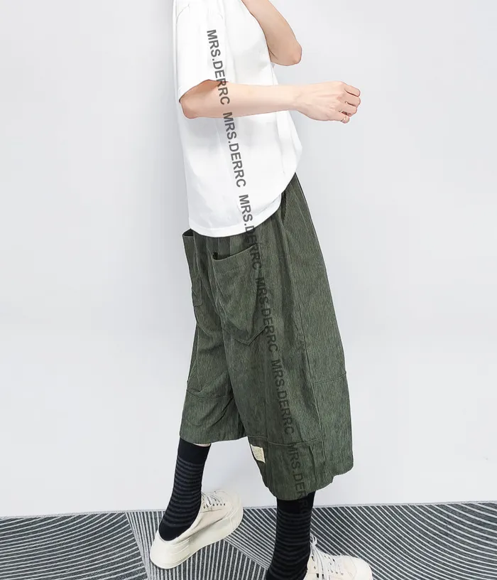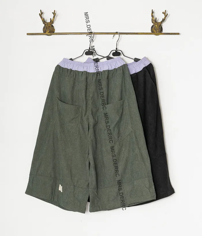 棉質撞色腰頭條絨口袋七分褲(綠色)