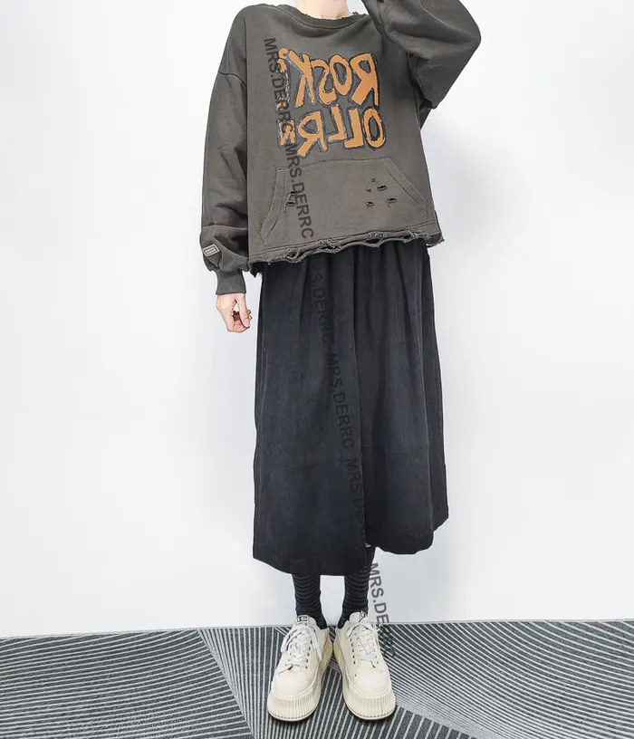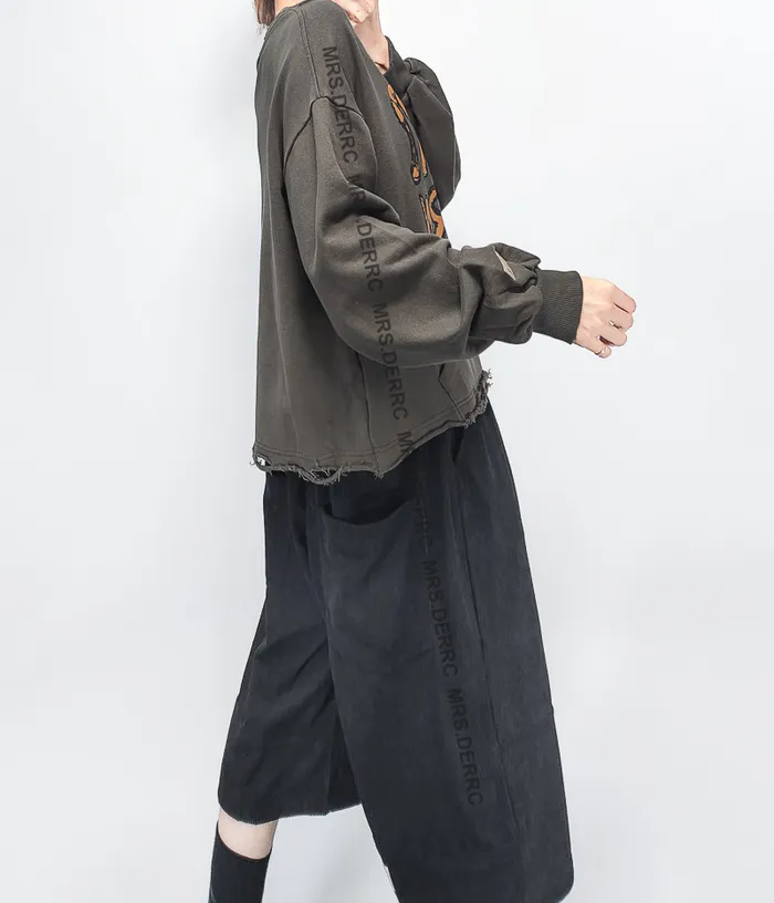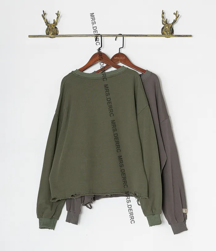 棉質領剪破捲邊塗鴉字母口袋上衣(深綠)