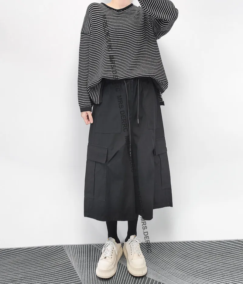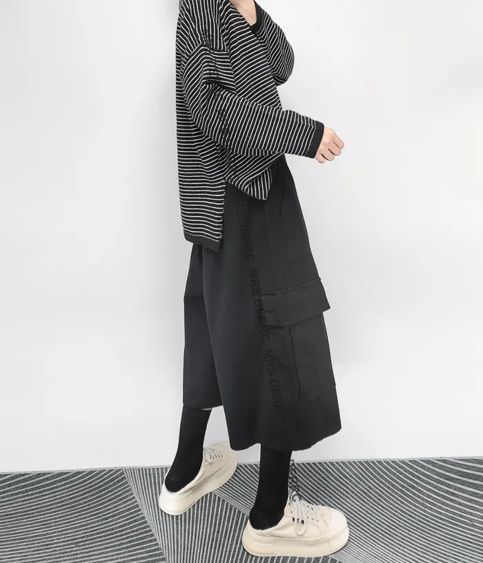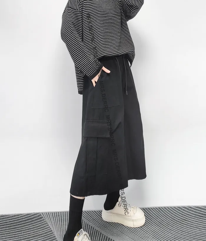 棉質造型腰頭開釦鬆緊口袋七分褲(黑色)