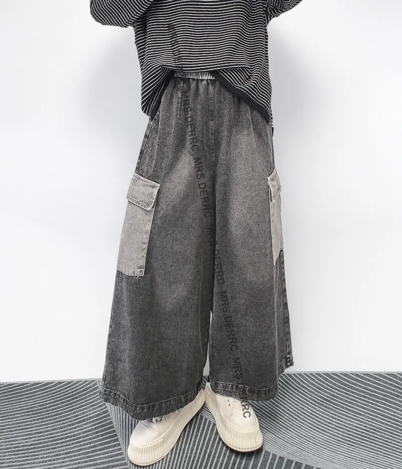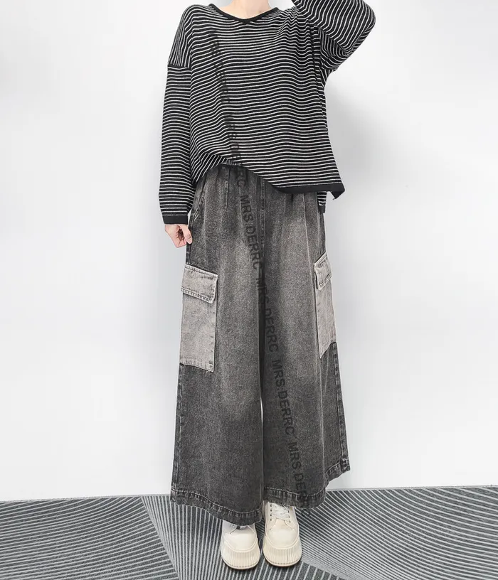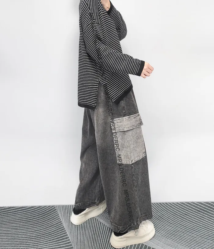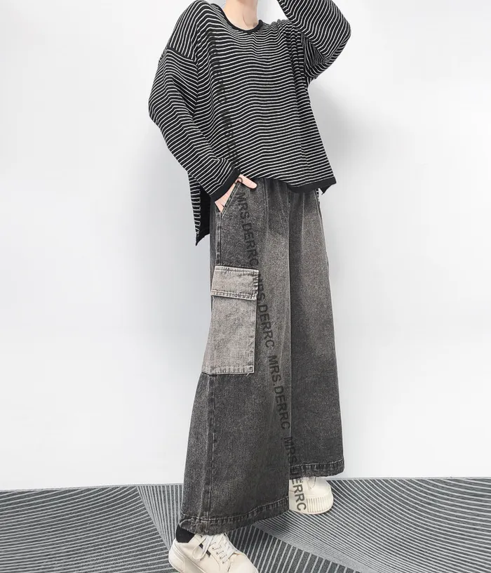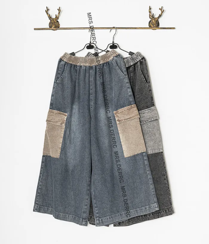 牛仔水洗刷色撞色拼接大口袋褲(灰黑)