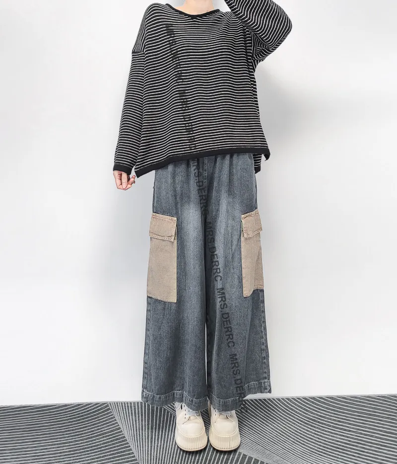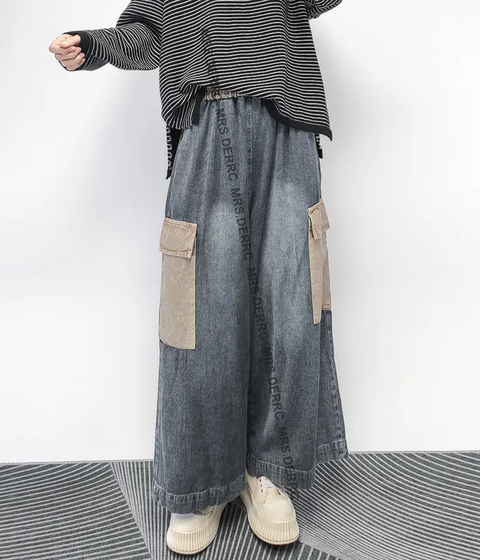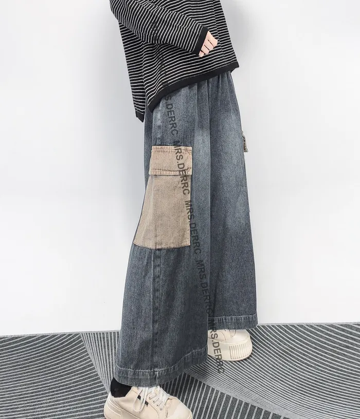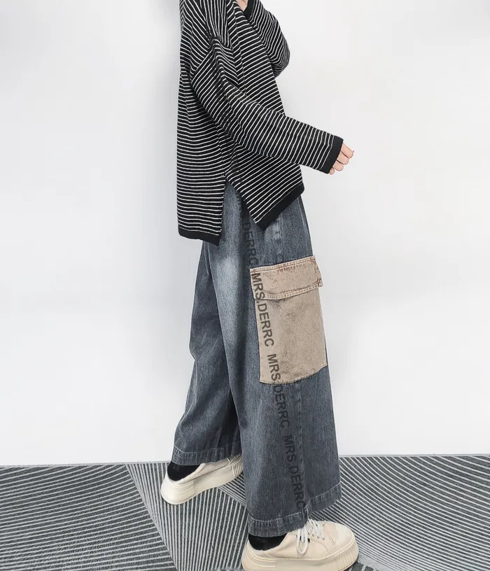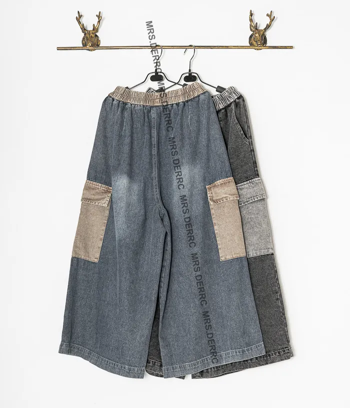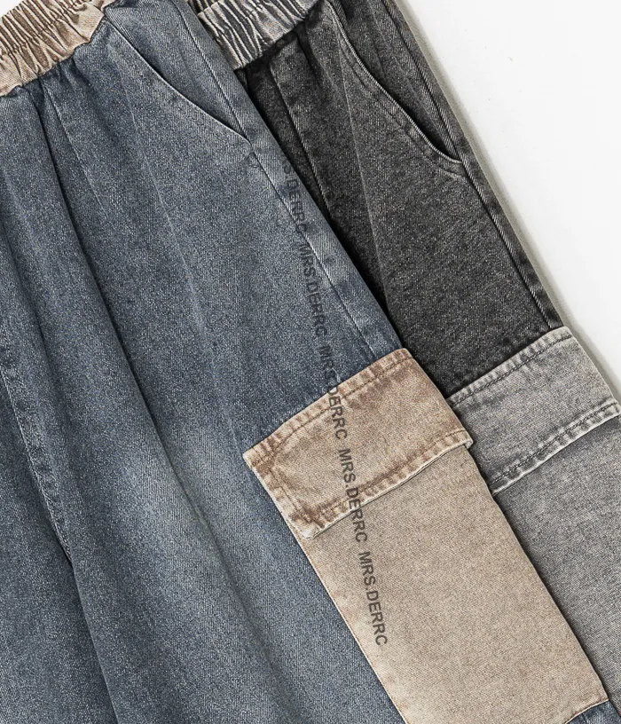 牛仔水洗刷色撞色拼接大口袋褲(藍色)