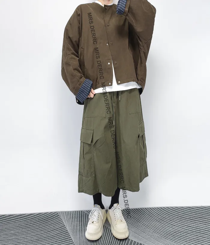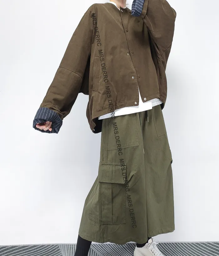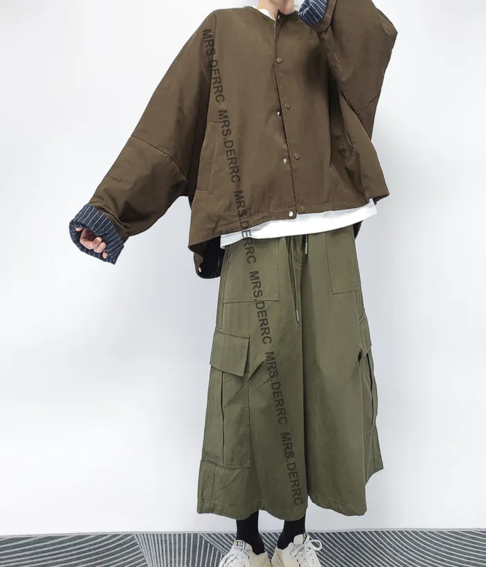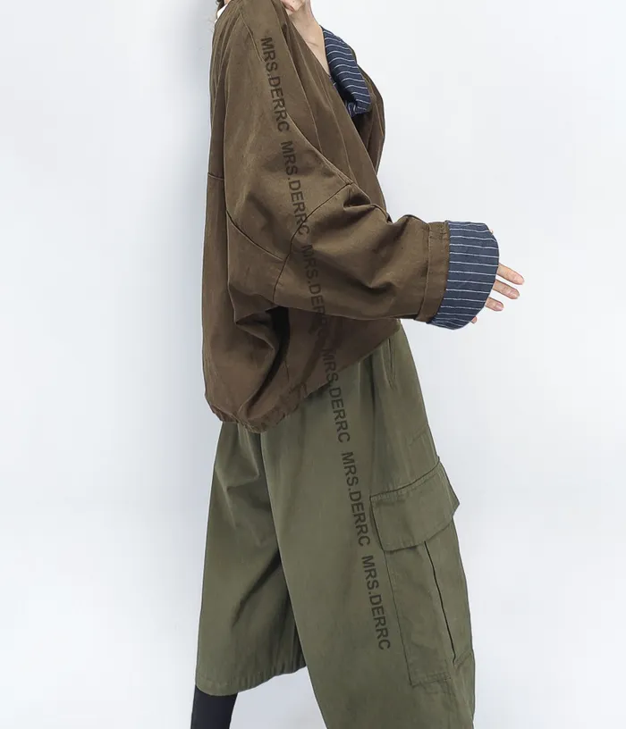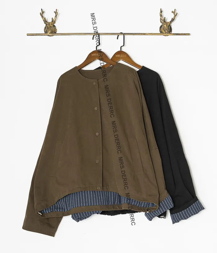 挺布棉條文內裡開釦口袋寬鬆外套(咖綠)