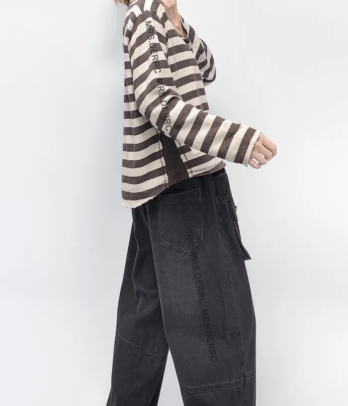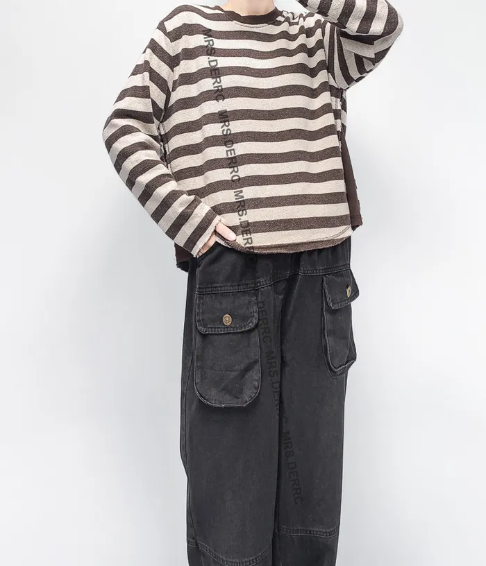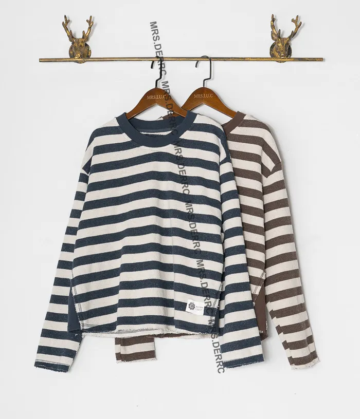 棉質水洗側拚接條紋不收邊上衣(咖條)