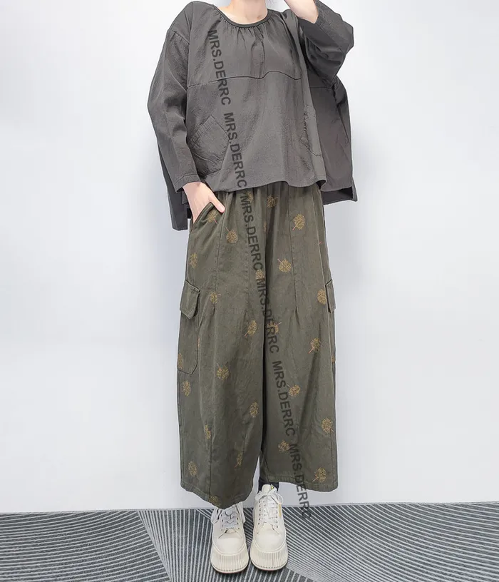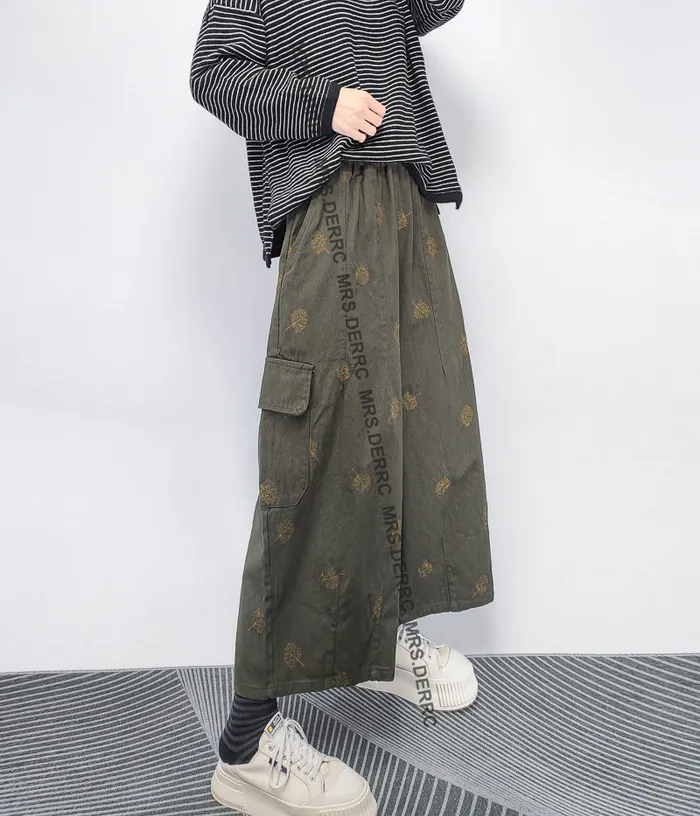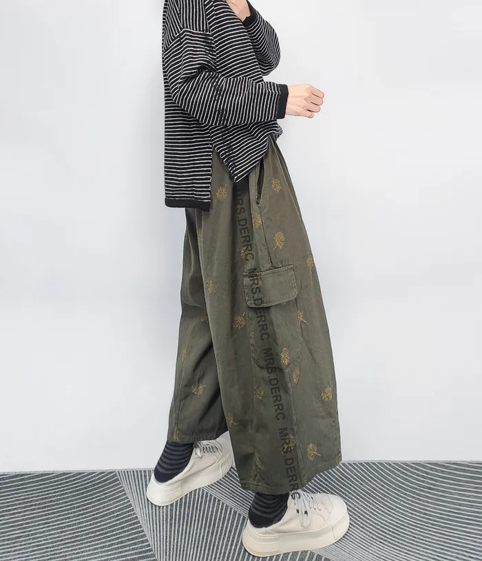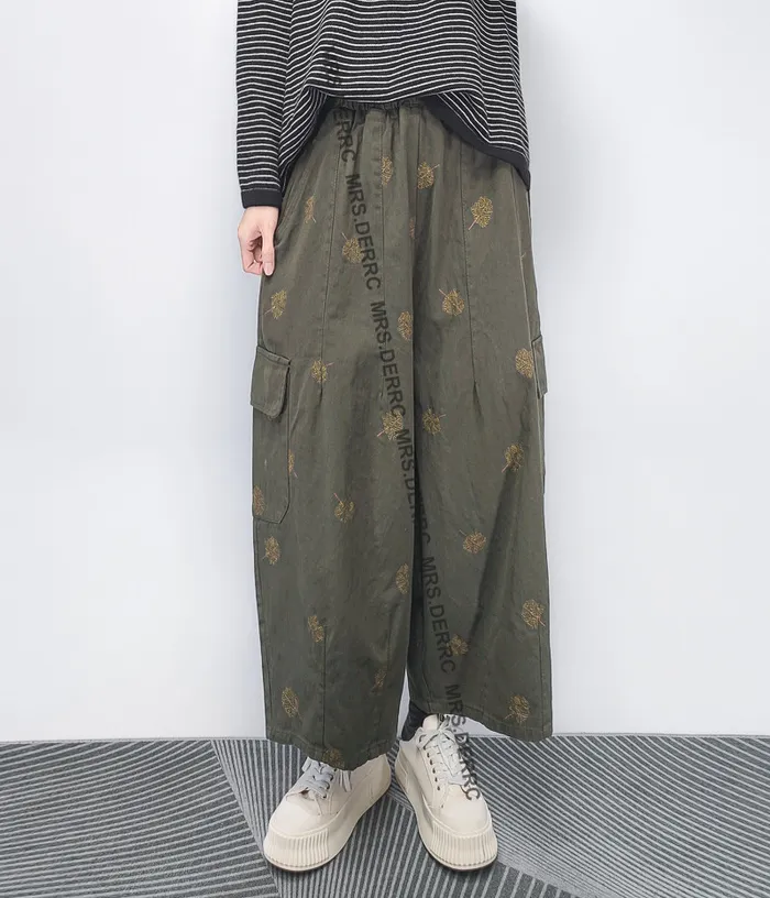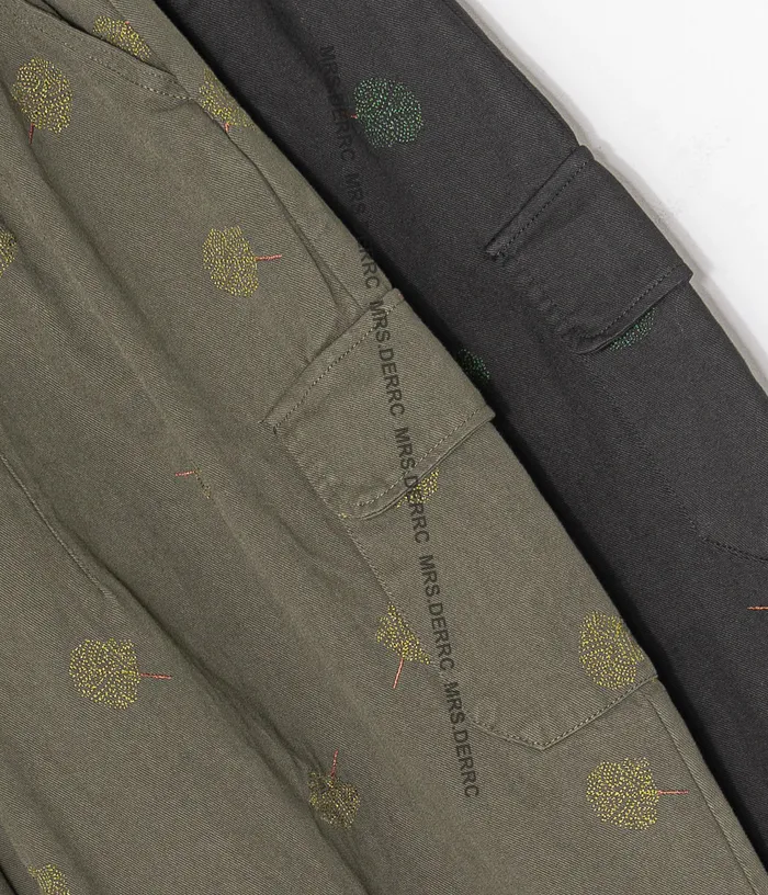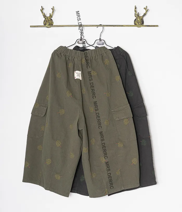 棉質斜紋刺繡小樹鬆緊口袋褲(綠色)