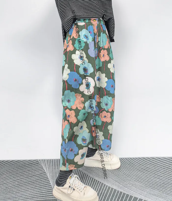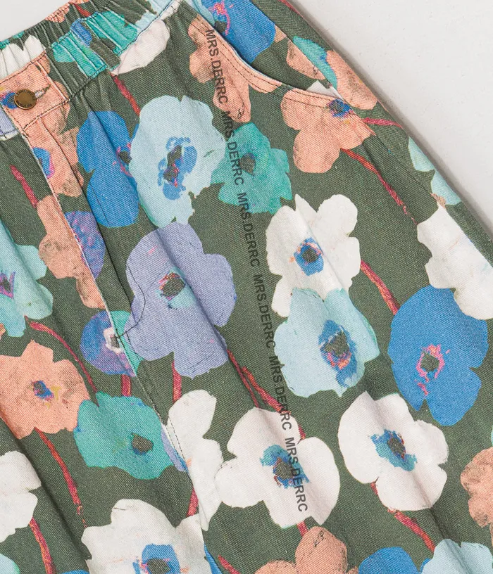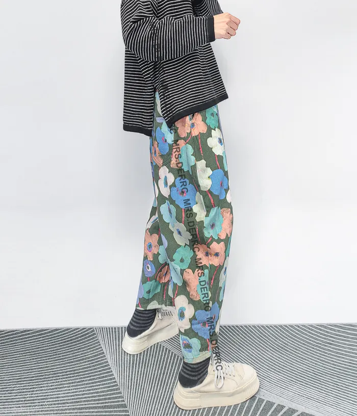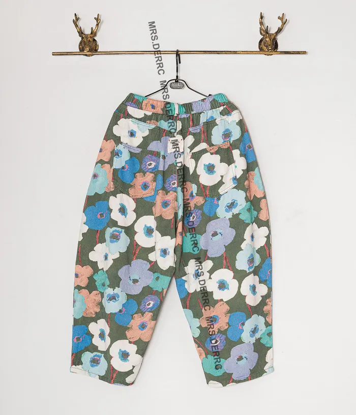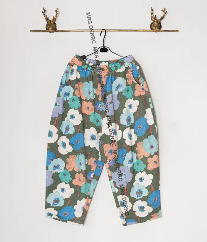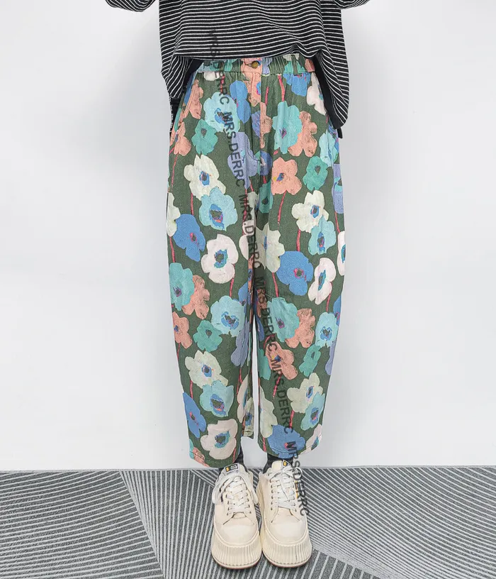 棉質水洗暈染花朵開釦鬆緊口袋褲