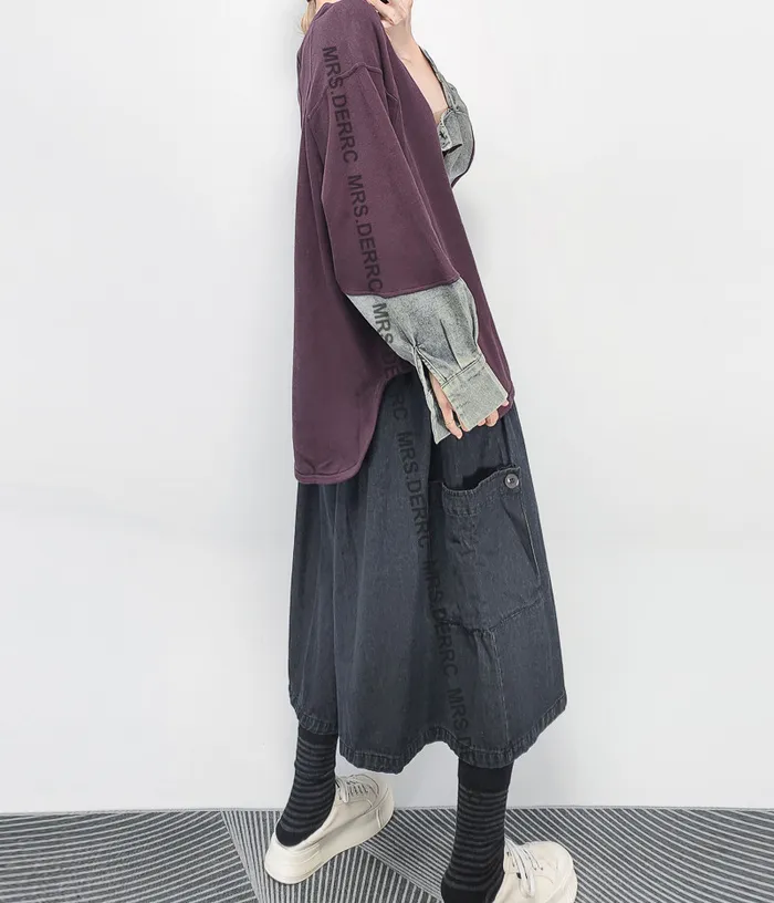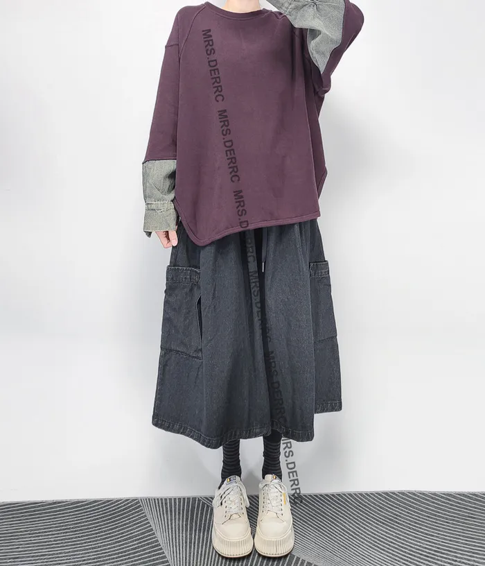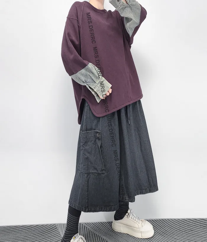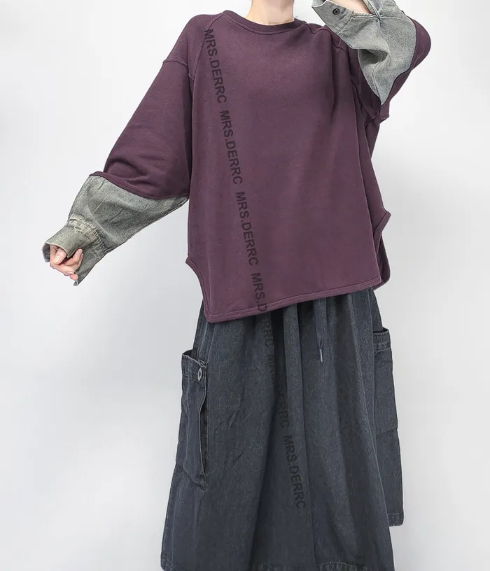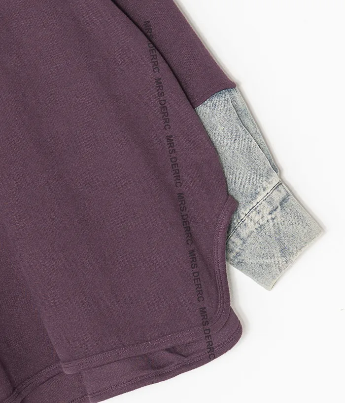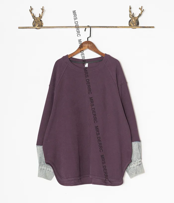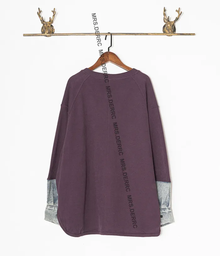 棉混紡牛仔拼袖圓弧下擺上衣(紫色)