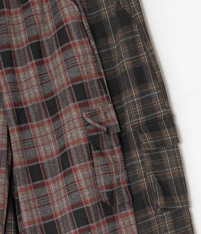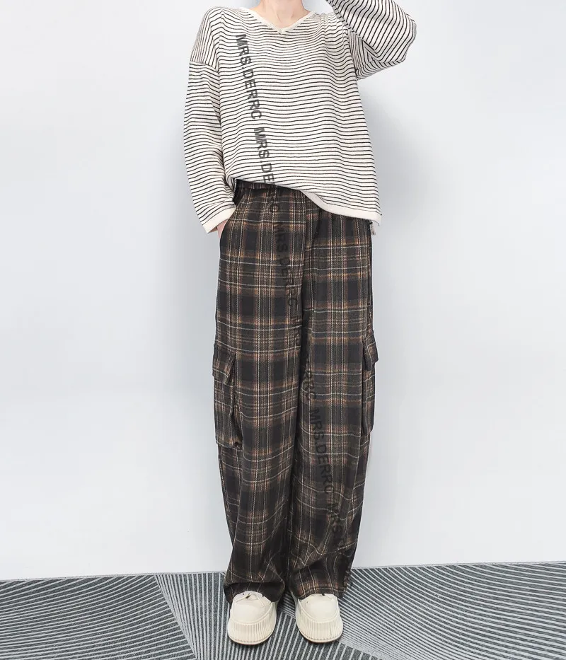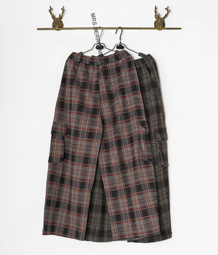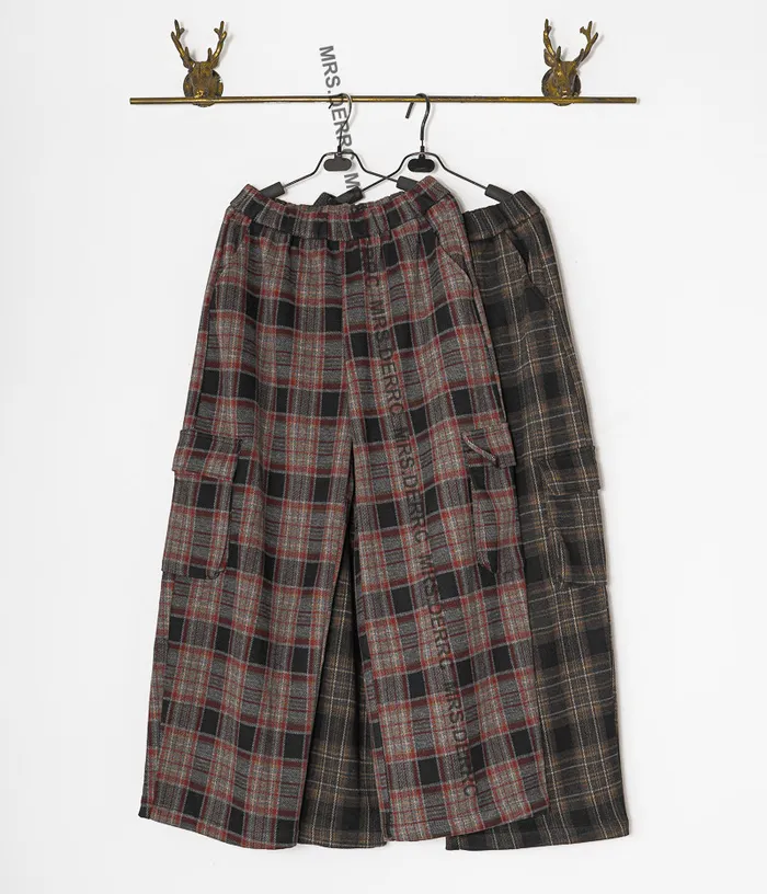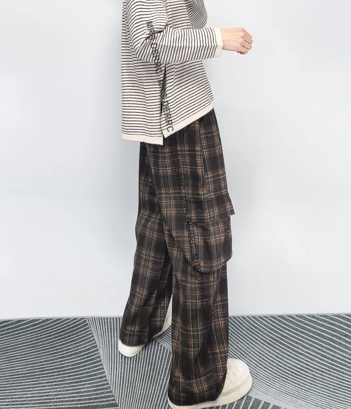 棉混紡毛呢格紋側邊口袋褲(咖格)