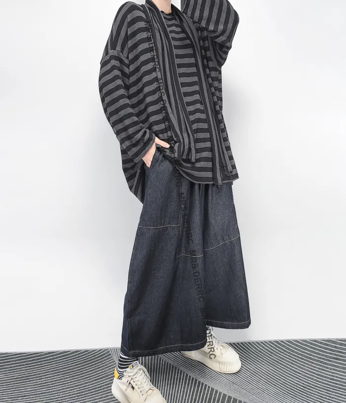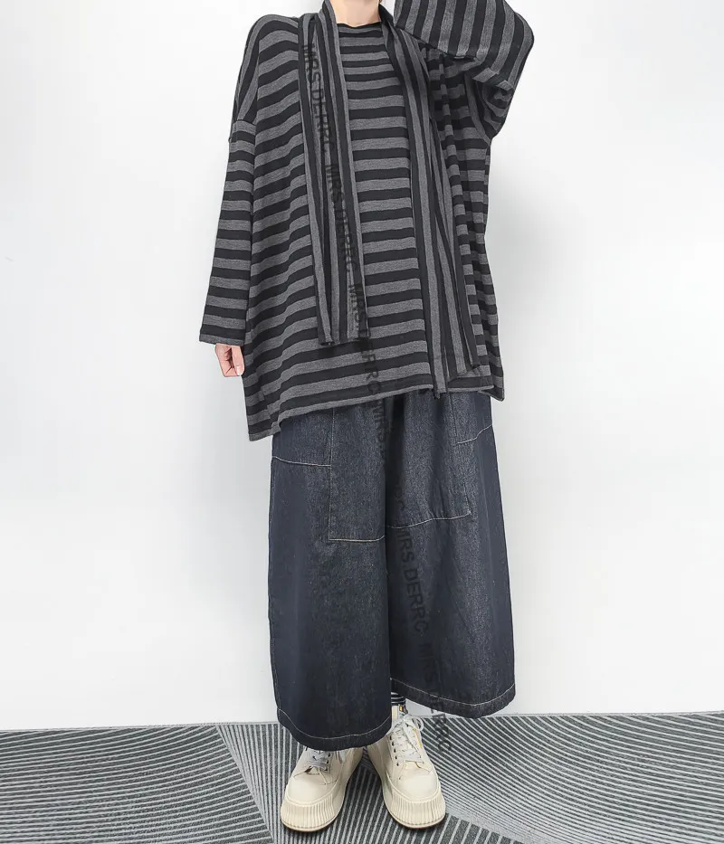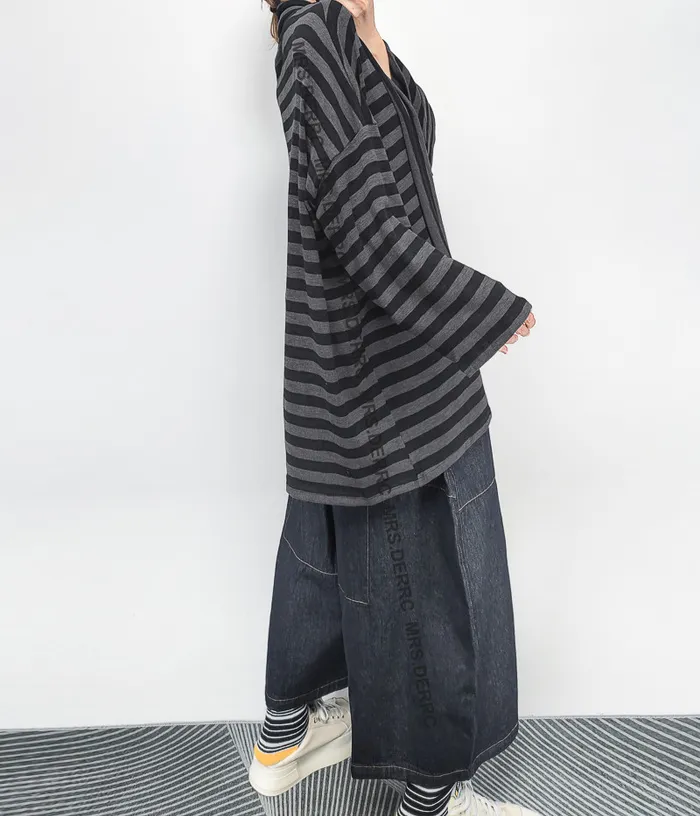 棉混紡軟料垂墜條紋寬鬆上衣(黑灰條)
